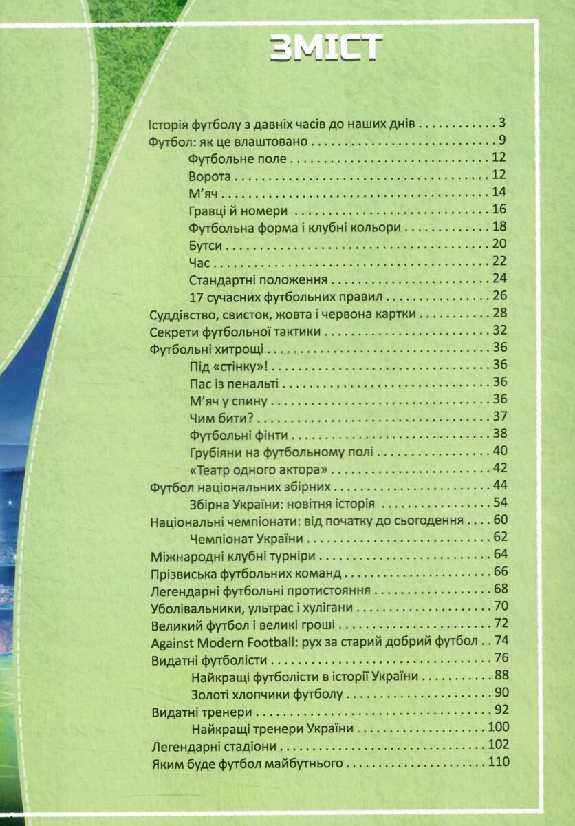 Ця книжка — зручний путівник у неосяжному і складному світі сучасного футболу. Тут читач знайде цікаві відомості про історію гри з м'ячем від її витоків до технологічно досконалої сучасності. Видання детально розповідає про правила гри, її еволюцію, особливості тактичних побудов та технічні прийоми, які використовують найкращі майстри світу.