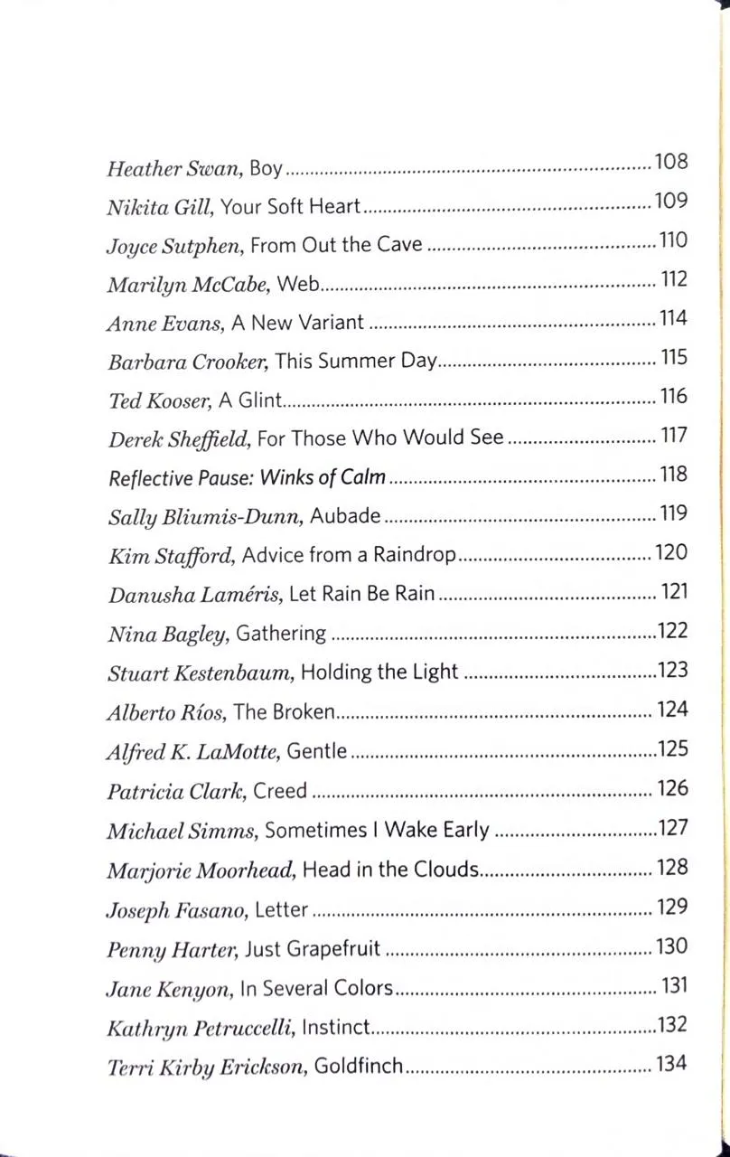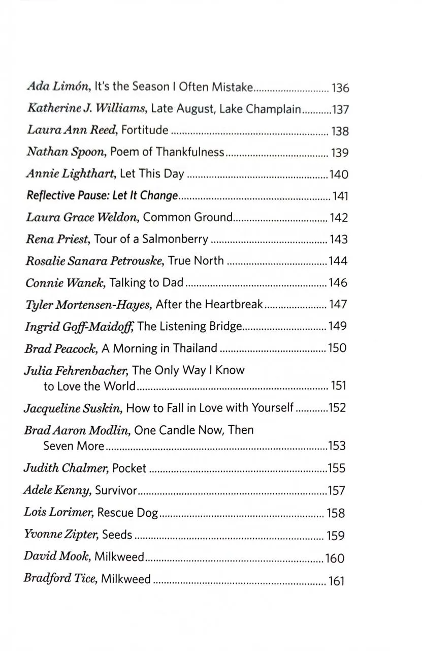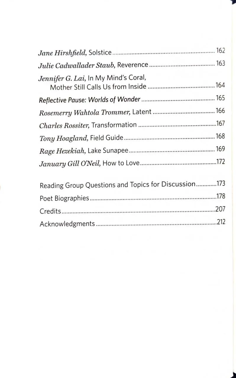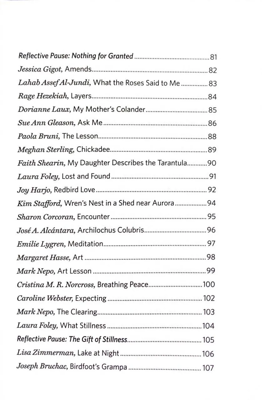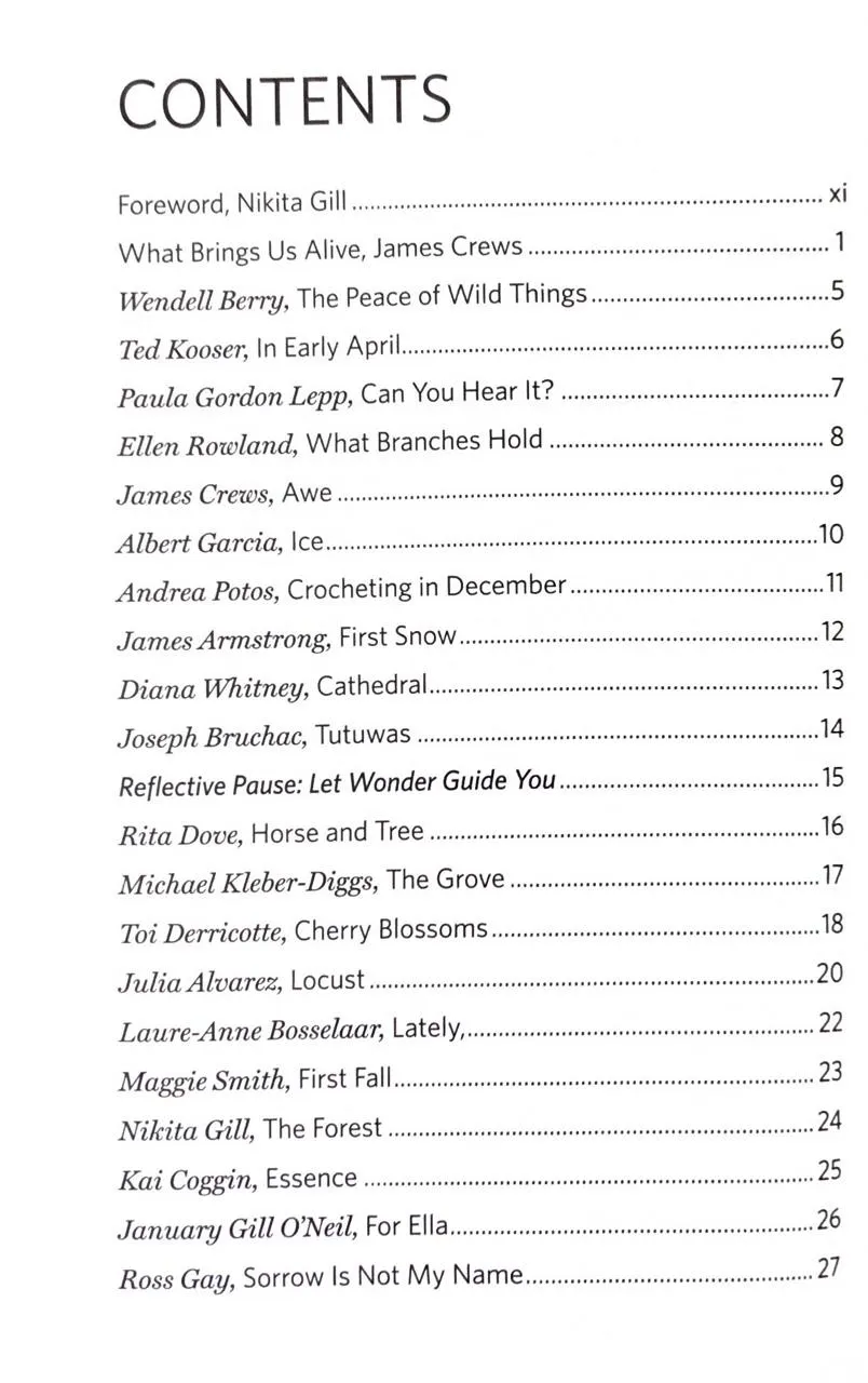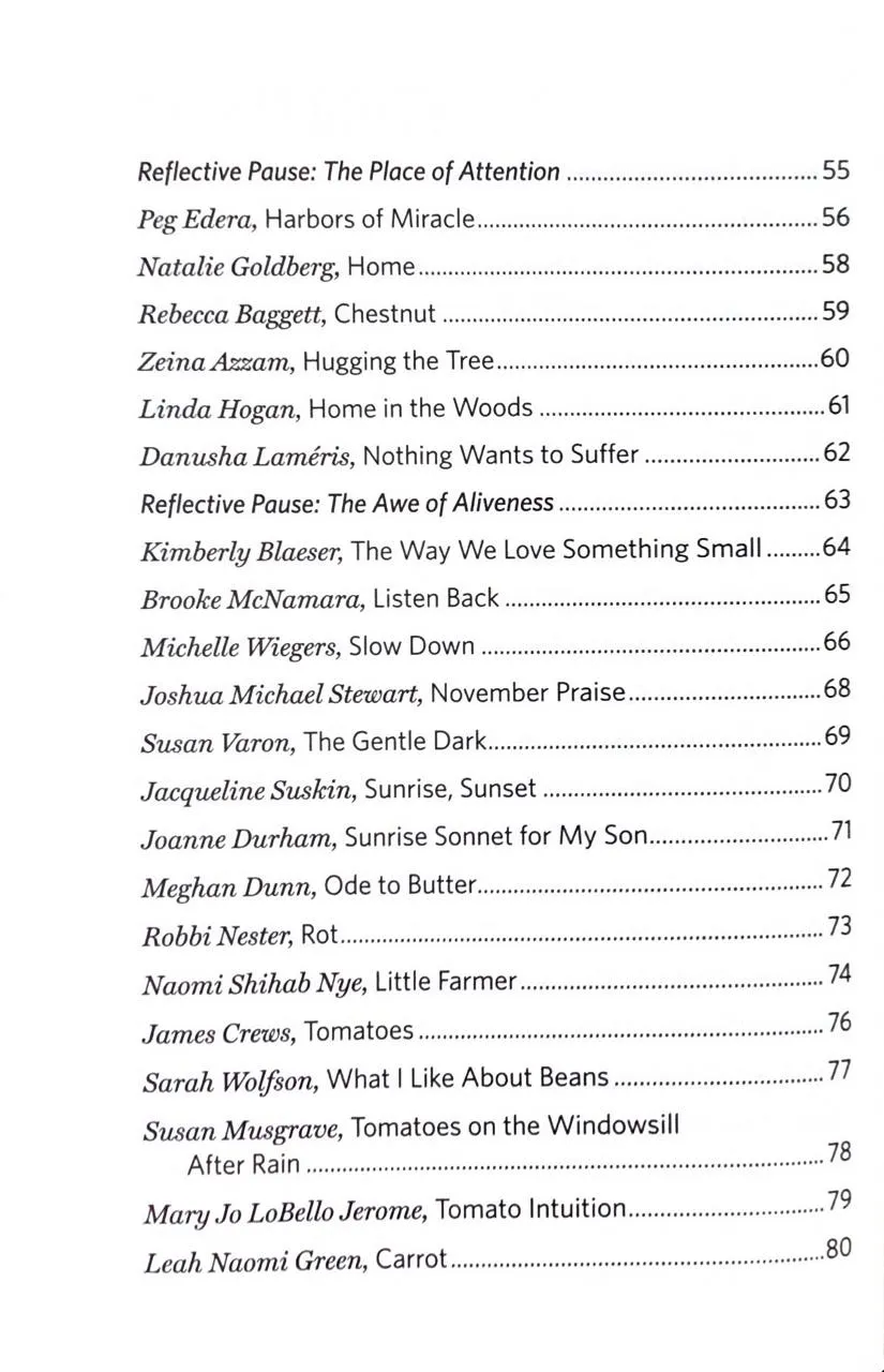 Збірка містить твори широкого кола авторів — від лауреатів премій до молодих голосів. Передмову до видання написала популярна поетка Нікіта Гілл. У книзі представлені вірші поетів корінних народів Америки, таких як Джой Харджо, та сучасних майстрів слова, як-от Росс Гей та Наталі Голдберг.