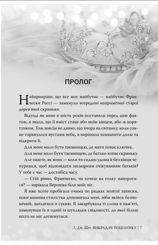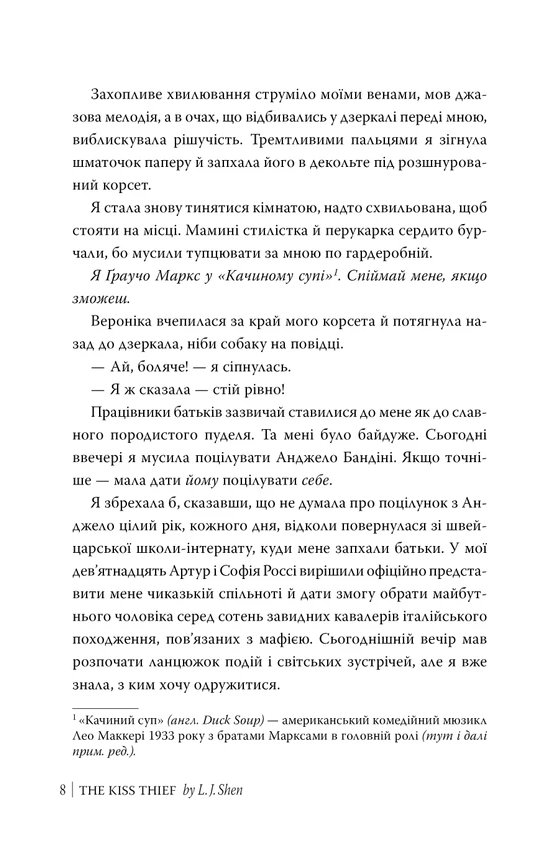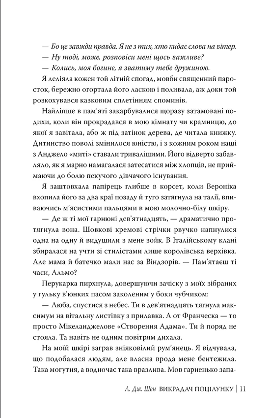 Викрадач поцілунку — це емоційний та відвертий роман від зірки сучасного любовного роману Л. Дж. Шен. Авторка майстерно занурює читача у світ жорстких правил чиказьких кланів, де почуття стають розмінною монетою, а шлюб — інструментом помсти.