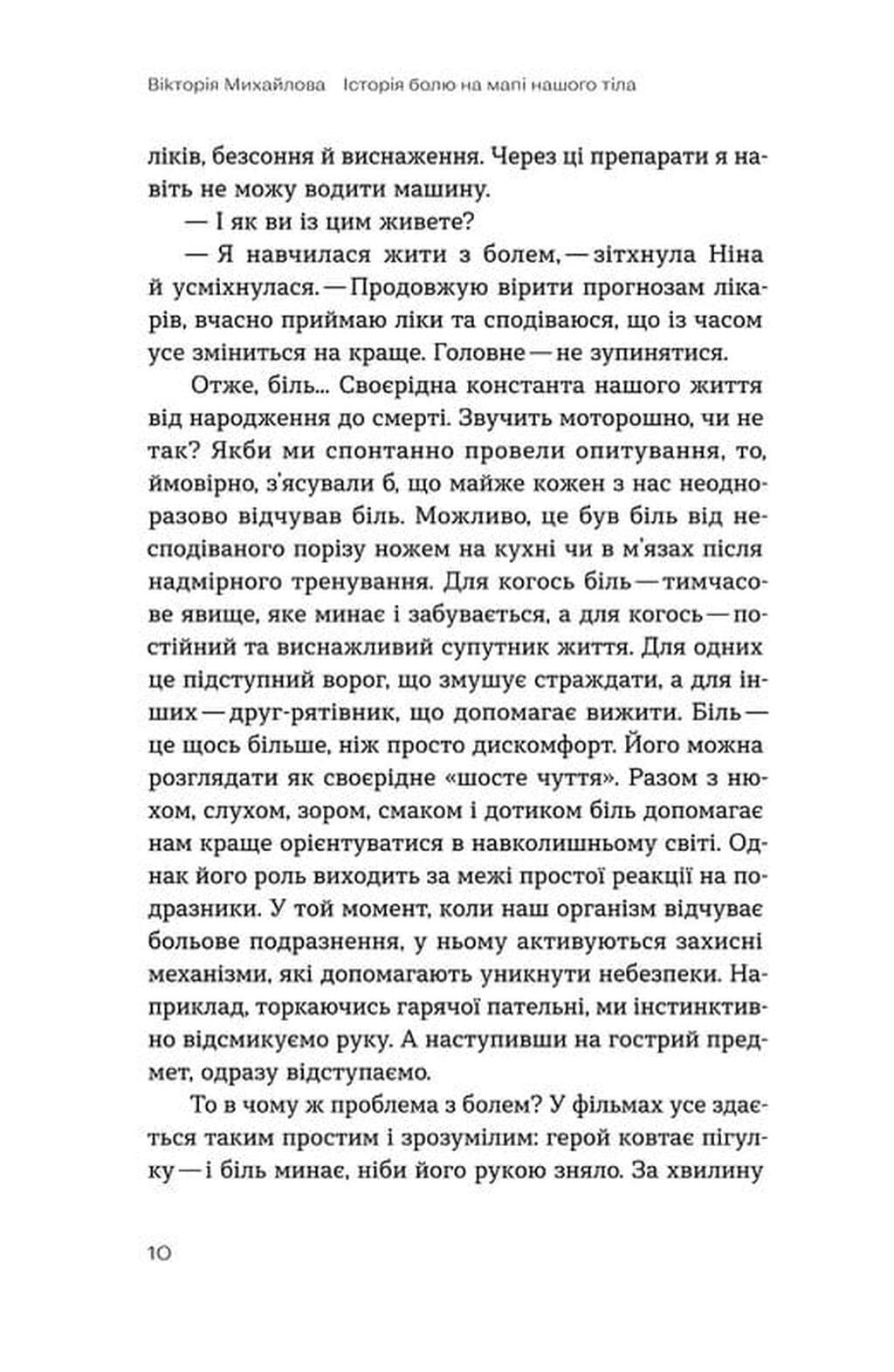 Авторка детально розбирає біль як комплексне явище, що має не лише сенсорний (фізичний), а й емоційний складник. Книга дає відповіді на складні запитання, які ми часто ставимо собі в кабінеті лікаря або біля аптечної полиці: