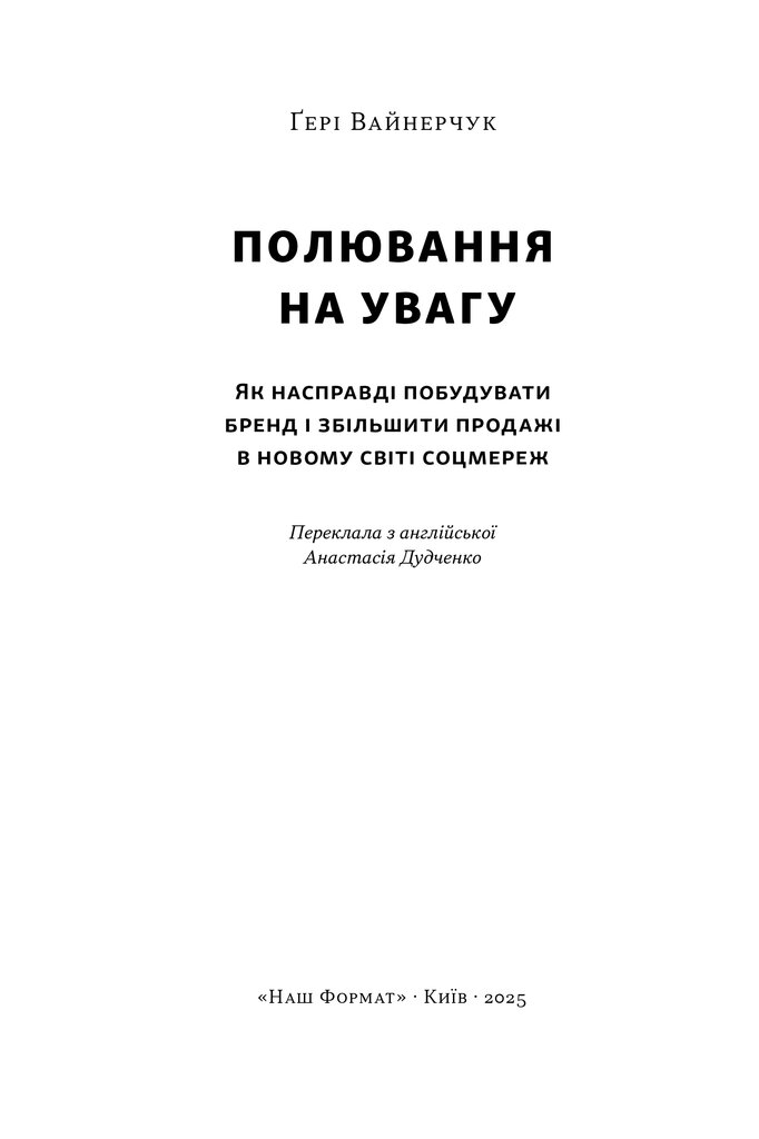 У цій книжці інвестор та експерт із маркетингу з понад 20-річним досвідом показує, як у світі нескінченного скролінгу перетворювати лайки на гроші й будувати бренд, що витримає конкуренцію. Він пояснює, що таке «увага», де її недооцінюють і як зробити її перевагою.