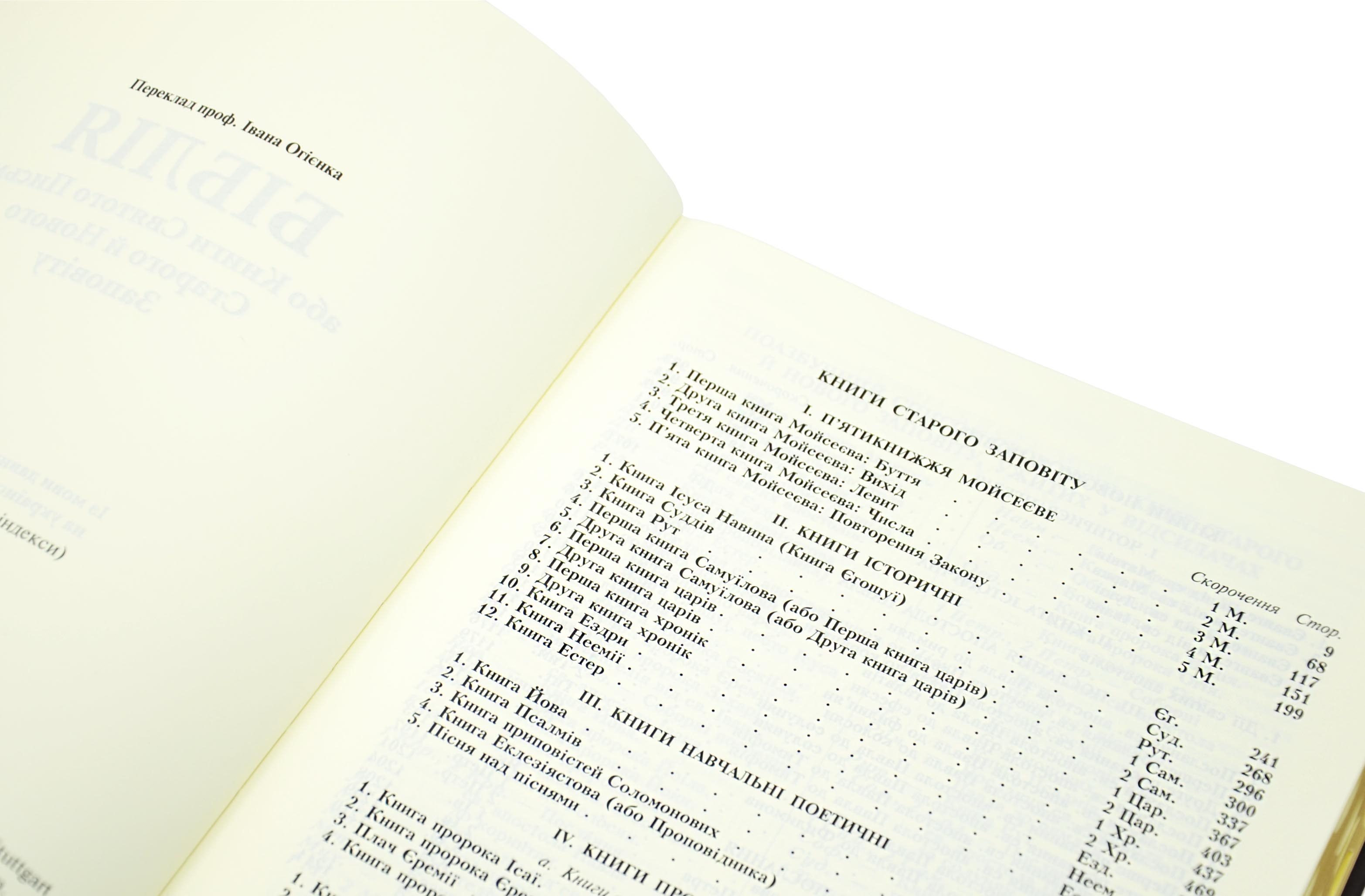 Це видання Святого Письма українською мовою є еталонним перекладом, здійсненим професором Іваном Огієнком безпосередньо з оригінальних мов — давньоєврейської та грецької. Канонічне видання охоплює всі книги Старого й Нового Заповіту, пропонуючи читачеві не лише духовну глибину, а й надзвичайну зручність завдяки продуманому оформленню та великому шрифту.