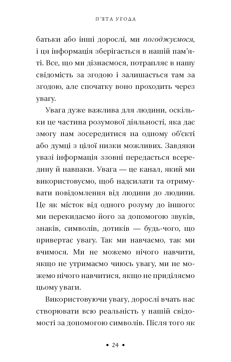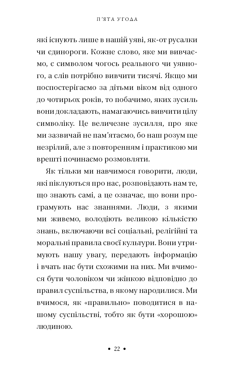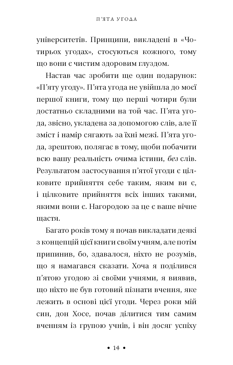 У книзі «Чотири угоди» дон Міґель Руїс пояснив, як процес нашого виховання, або одомашнення, може змусити нас забути мудрість, із якою ми народилися. У книзі «П’ята угода» він разом із сином доном Хосе Руїсом пропонує свіжий погляд на свій бестселер і нову потужну угоду для перетворення нашого життя на особистий рай. «П’ята угода» підводить нас до глибшого рівня усвідомлення сили власного «Я» і повертає до автентичності, з якою ми народжуємося. У цьому захопливому продовженні книги, яка змінила життя мільйонів людей у всьому світі, нам нагадують про найбільший дар, який ми можемо собі дати: свободу бути тим, ким ми є насправді.