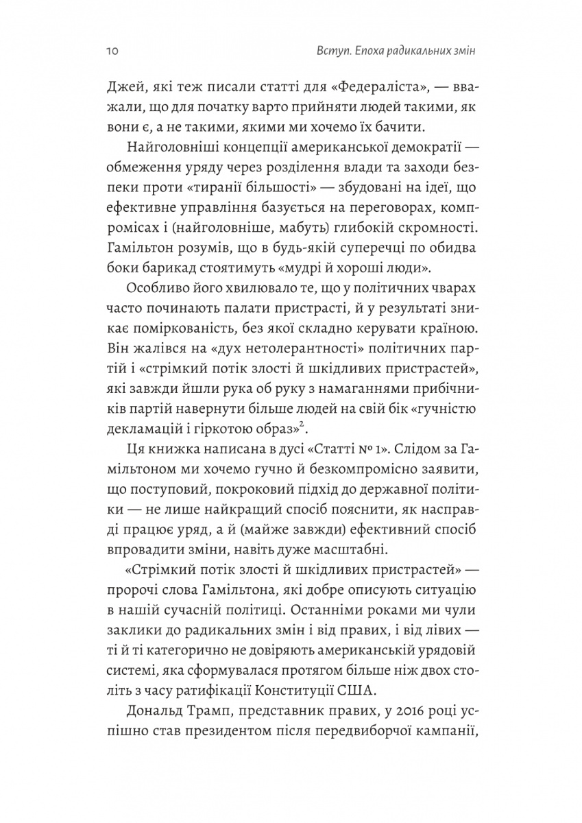 «Поступовість» Греґа Бермана та Обрі Фокс доводить, що всупереч радикальним прагненням активістів, саме покроковість у впровадженні реформ — найкращий шлях уперед. Автори підкреслюють, що в часи інтенсивної поляризації — поділу на «чорне» і «біле» — будь-які зусилля, спрямовані на просування радикальних змін, неминуче викличуть значну зворотну реакцію. Громадськість мало підтримує сміливі зміни, однак готова підтримати широкий спектр поступових реформ, які, в разі їхньої реалізації, зменшать страждання і підсилять справедливість. Щоб проілюструвати, як поступові зміни з часом можуть призвести до значних змін, Берман і Фокс наводять портрети «героїчних інкременталістів», які здійснили значущі реформи в різних сферах — від розширення системи соціального забезпечення до зниження рівня злочинності й ув'язнення.