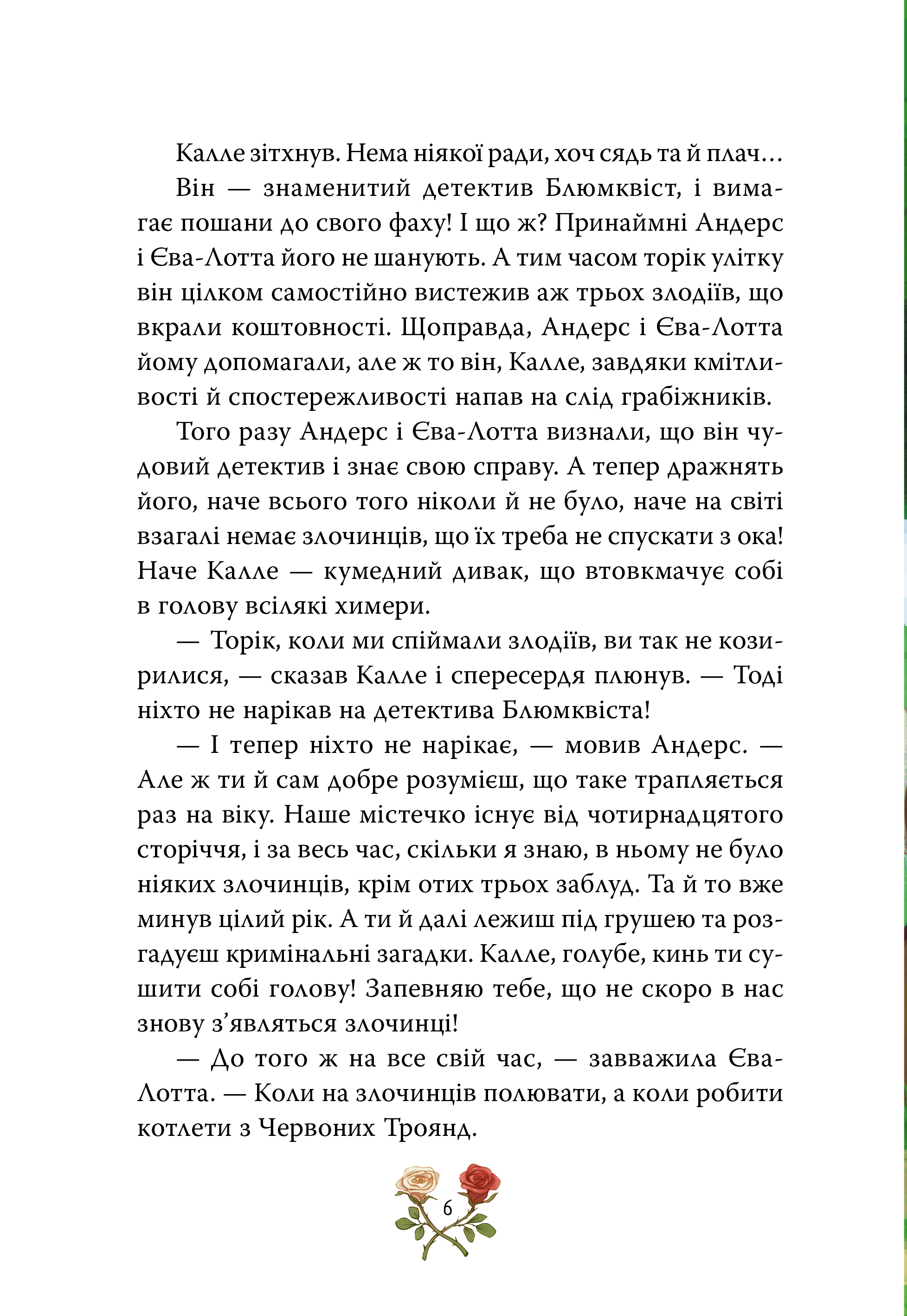 У другій книжці циклу діють як уже знайомі, так і нові герої. Бути детективом — це чудово, але Калле вирішив тимчасово облишити розслідування, адже в місті панує спокій, а друзі кличуть до розваг. Оголошено війну Червоної та Білої Троянд! Веселе товариство невгамовних дітей вирушає у справжнісінькі «Прерії» за містом, де відбуваються лицарські поєдинки, облоги замків, а головною метою стає загадковий Великий Мумрик.