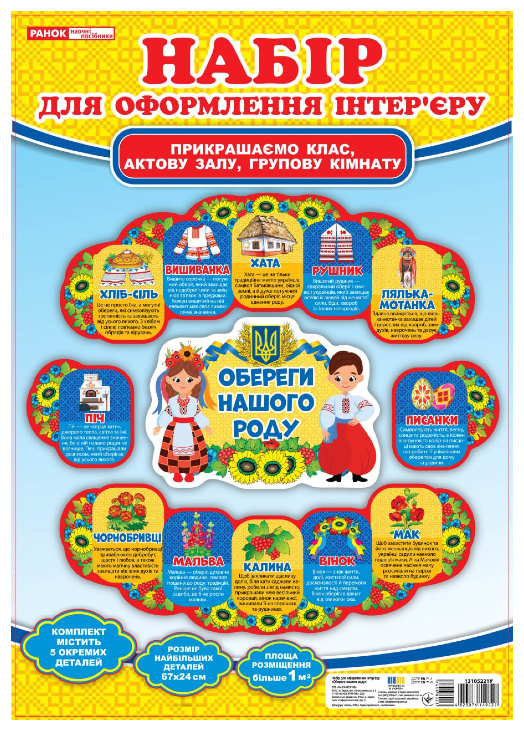 Комплект для оформлення інтер'єру «Обереги нашого роду» – це не просто прикраса, а справжній символ єдності поколінь та любові до України. Він наповнить простор духом національних традицій і стане чудовим акцентом у класній кімнаті, кабінеті чи на святкових заходах.