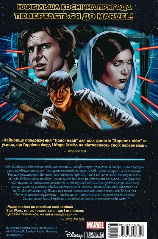 Скайвокер завдає удару. Зоряні Війни — це епічне повернення до класичної епохи легендарної саги. Сценарист Джейсон Аарон та художник Джон Кесседі переносять нас у часи одразу після знищення першої Зірки Смерті. Альянс повстанців здобув перемогу, але війна за свободу Галактики тільки починається. Це видання — ідеальний старт для тих, хто хоче дізнатися, що відбувалося між четвертим та п'ятим епізодами кіновсесвіту.