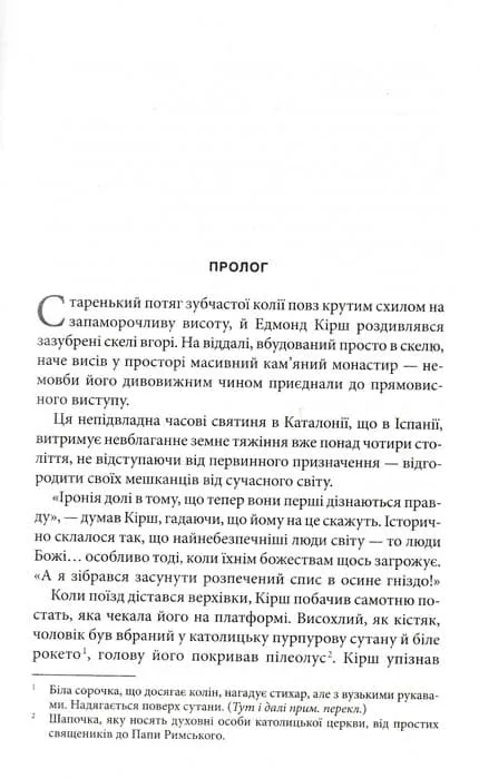 Століттями релігії світу намагалися пояснити походження людини. І ось Кірш — колишній учень Роберта Ленґдона, відомий мільярдер та винахідник — здійснює приголомшливе відкриття, яке здатне не просто похитнути, а й спростувати постулати всіх релігій. На сенсаційну лекцію в музеї Ґуґґенгайма запрошено і професора Роберта Ленґдона. Але Кірш не встигає викласти свою неймовірну теорію — його вбивають. Матеріали лекції Кірша захищені 47-значним паролем… Тепер від професора Ленґдона та директорки музею Амбри Відаль залежить, чи дізнається світ таємницю свого походження. Складні головоломки, втеча від іспанської поліції, смертельні сутички, загадки, схожі на химерні будівлі славетного Ґауді, запаморочливі сплетіння вуличок Барселони — і десь серед цього виру сховане воно, джерело…