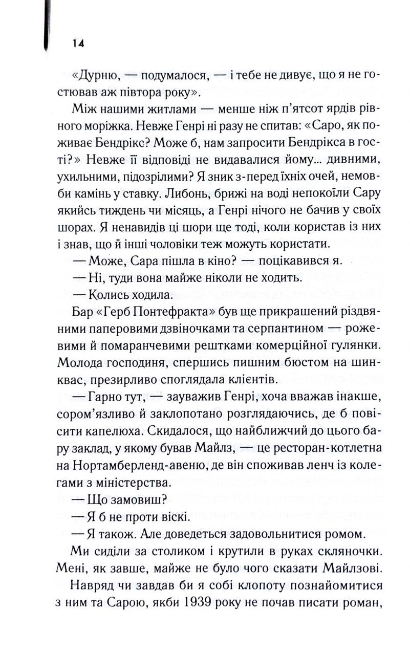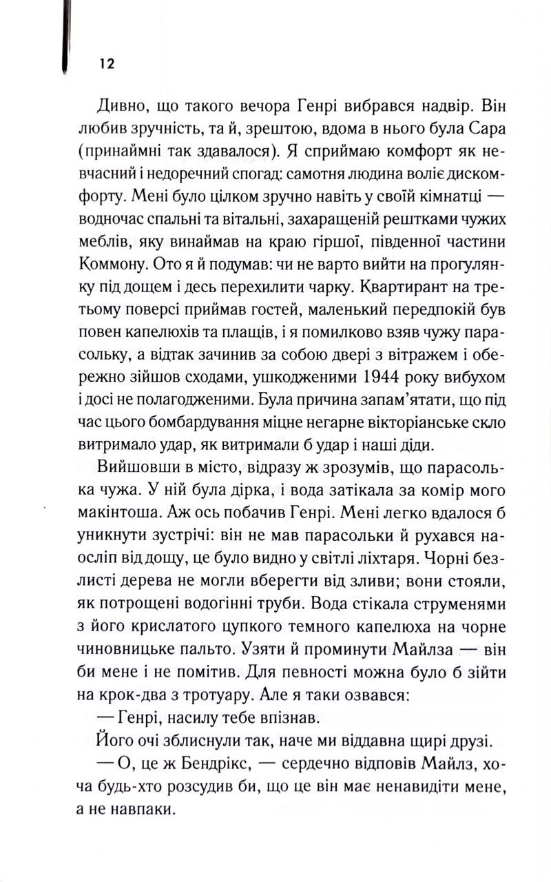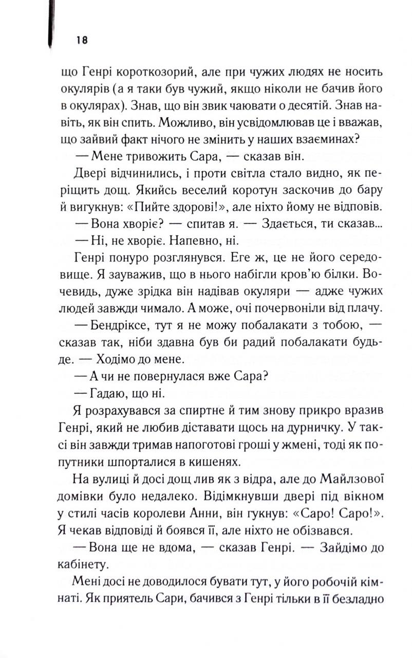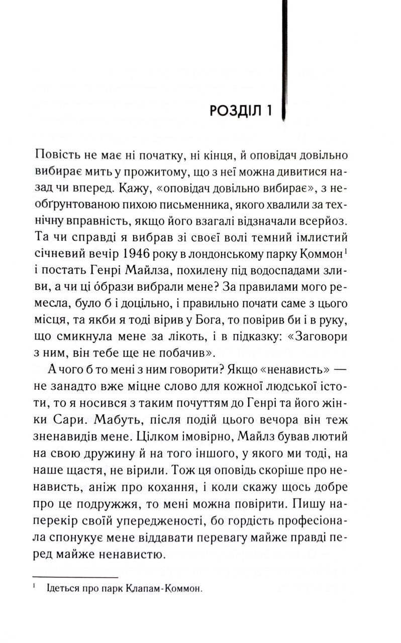 Колись Моріс і Сара були єдиним цілим. Їхнє почуття розквітло в Лондоні часів Другої світової війни — серед бомбардувань, страху та постійного відчуття крихкості життя. Це було кохання, сповнене пристрасті й відчаю, таке, що здавалося сильнішим за обставини й навіть за смерть.