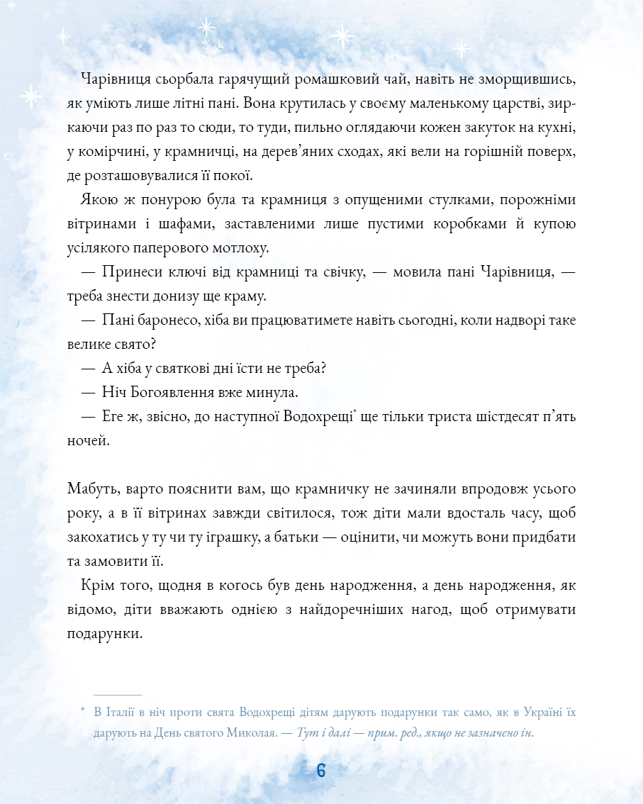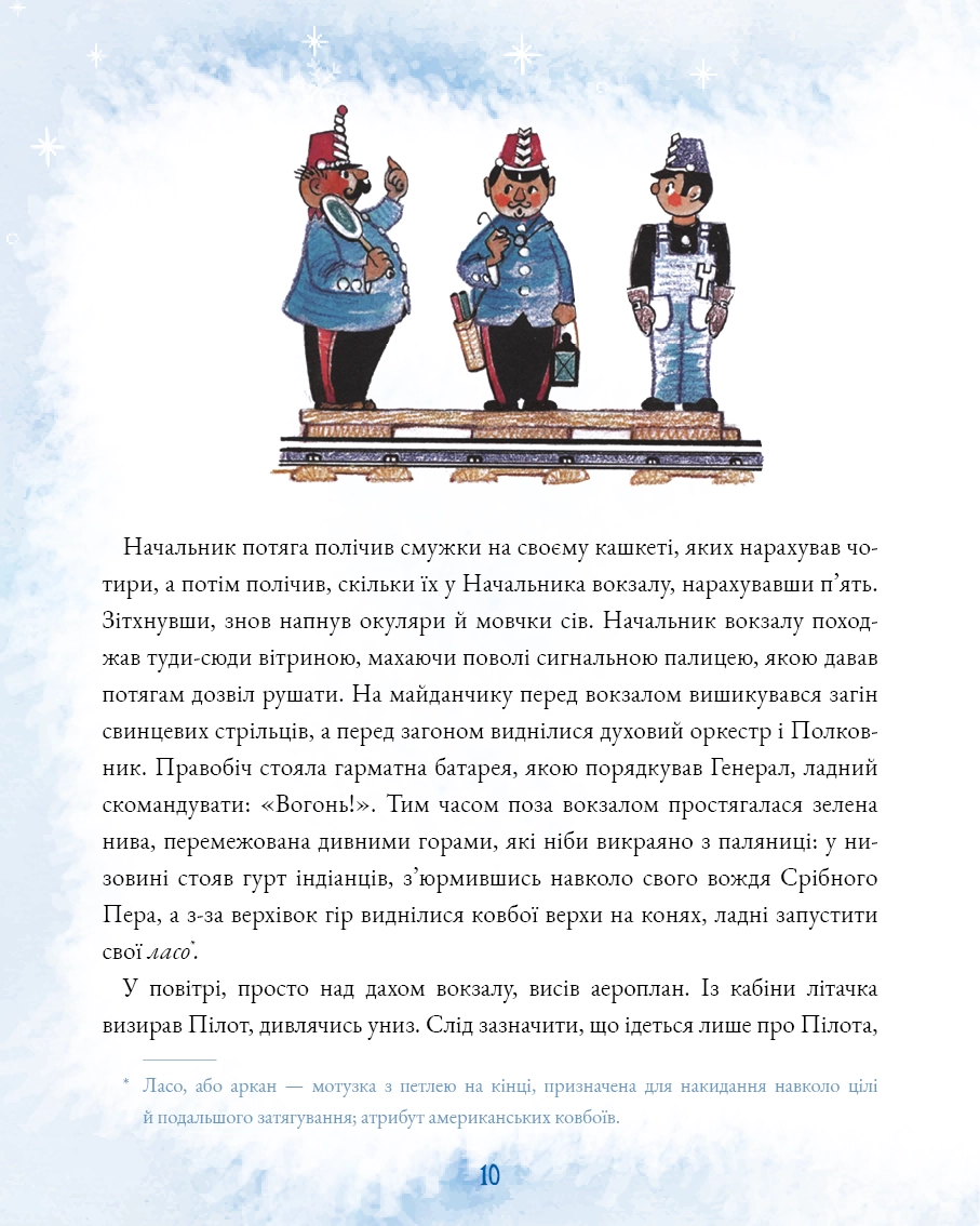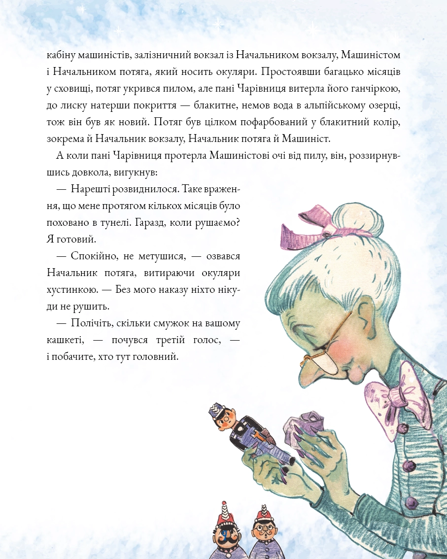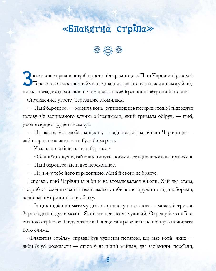 «Блакитна стріла» — прекрасний потяг, що стоїть у вітрині крамнички пані Чарівниці — полонить погляд маленького Франческо, який продає льодяники в кінотеатрі та якому ніколи не стане коштів, щоб придбати таку іграшку. Утім навіть іграшки мають серце, тож у ніч проти свята Водохрещі всі вони сідають у потяг; так починається їхня захоплива мандрівка назустріч дітлахам, які по-справжньому мріють про них. Джанні Родарі легко говорить про важливі часи, а його фантастичний потяг їде коліями згуртованості, зупиняючись на станціях дружби, і мчить назустріч радісному майбутньому. Книга чудово підійде до новорічних та різдвяних свят, для читання разом з батьками, дітям молодшого та середнього шкільного віку.
