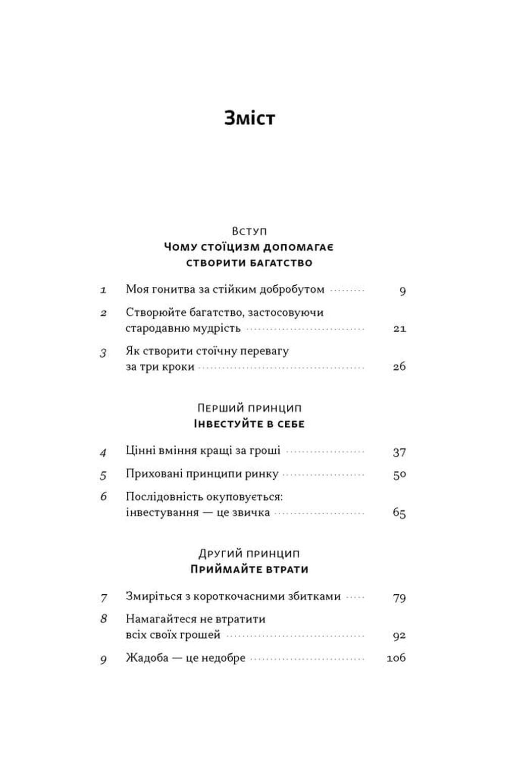 Стоїчний шлях до багатства. Стародавня мудрість для стійкого добробуту — це унікальне поєднання класичної філософії стоїцизму та сучасних стратегій інвестування від відомого автора та підприємця Даріуса Фору. У світі, що постійно змінюється, де ринки нестабільні, а майбутнє туманне, Фору пропонує звернутися до принципів Епіктета, Марка Аврелія та Сенеки. Він переконливо доводить: успіх в інвестуванні на 10% залежить від знання ринку і на 90% — від вашої дисципліни та емоційного контролю. Ця книга навчає фокусуватися на тому, що підвладне лише вам: власних судженнях, звичках та довгостроковій візії, ігноруючи зовнішній шум та паніку.