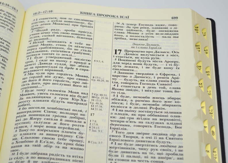 - В наявності вказівники (індекси) для пошуку книг Біблії