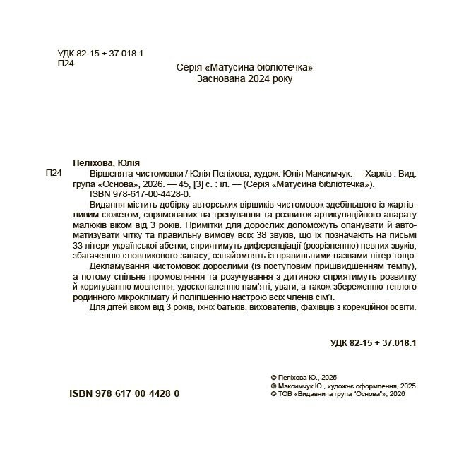 Зробіть крок назустріч впевненому мовленню вашого малюка. Віршенята-чистомовки — це не просто книга, а веселий тренажер, який дитина проситиме почитати знову і знову. Замовляйте новинку на Bookopt і відкривайте світ звуків легко та з усмішкою!