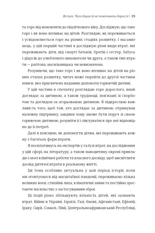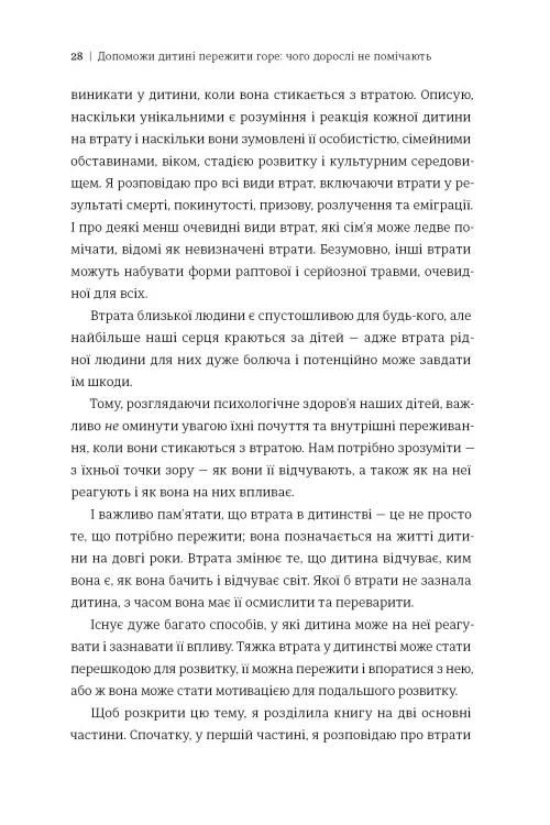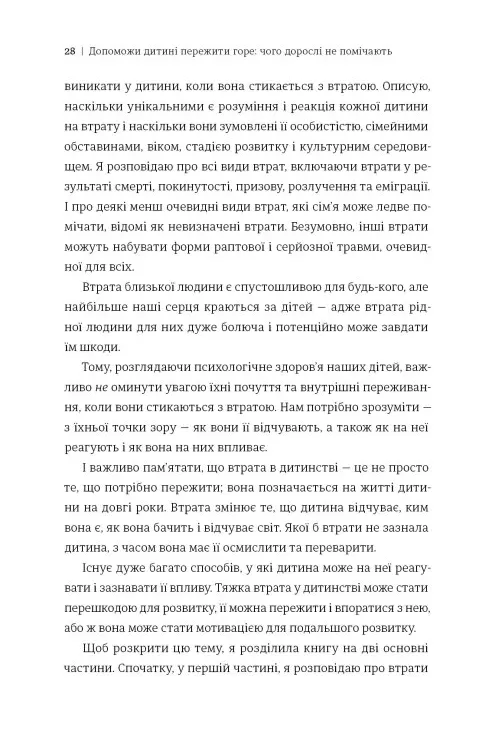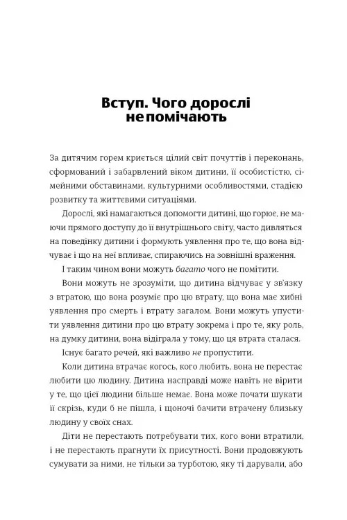 Допоможи дитині пережити горе. Чого дорослі не помічають — це надзвичайно важлива праця відомої американської психологині, докторки Корінн Мазур. Спираючись на власний болючий досвід втрати батька в юності та десятиліття клінічної практики, авторка розкриває особливості дитячої скорботи, які часто залишаються невидимими для дорослих. Книга вчить нас «чути» мовчання дитини та розуміти її поведінку після втрати близьких, розлучення батьків, переїзду чи навіть смерті домашнього улюбленця. Це не просто теоретичне дослідження, а дієвий інструмент, наповнений співчуттям, реальними історіями та чіткими рекомендаціями, що допоможуть зцілити поранену дитячу душу.