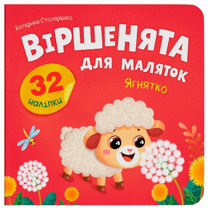 Віршенята для маляток. Ягнятко — це видання для розвитку мовлення, уваги та діалогів із дитиною. У книжці короткі віршики про тварин, великі ілюстрації та 32 наліпки, які малюк розташовує на відповідних сторінках. На кожному розвороті — сюжетна сценка і просте запитання до дитини: «Що на малюнку білого кольору?», «Що робить цуценятко?».
