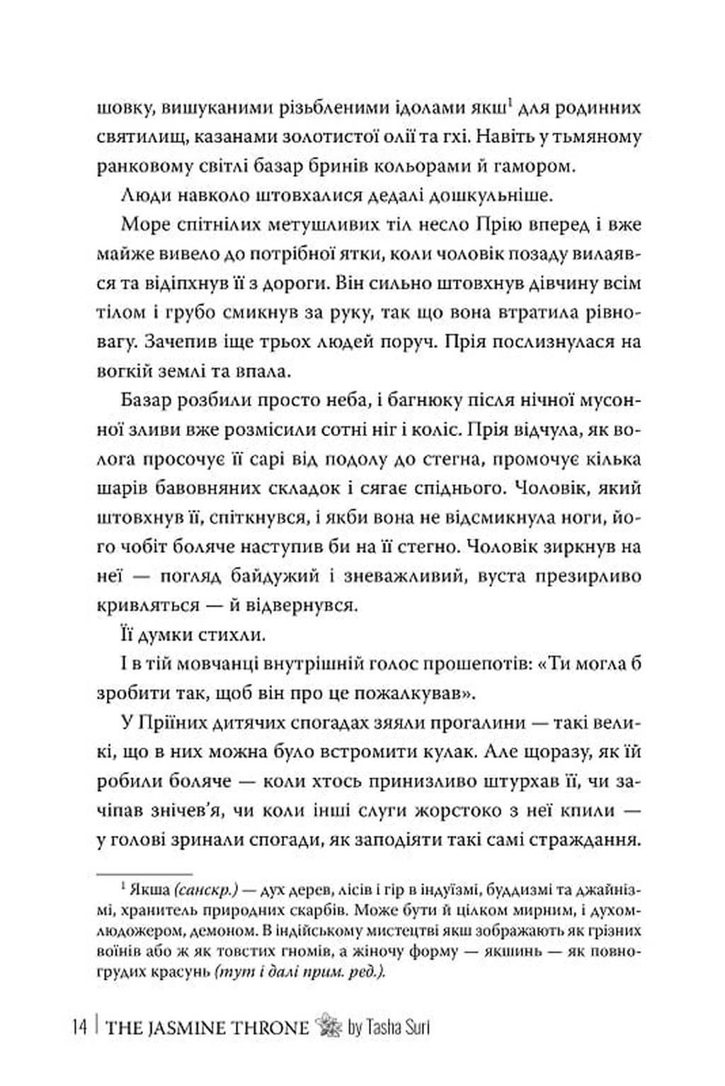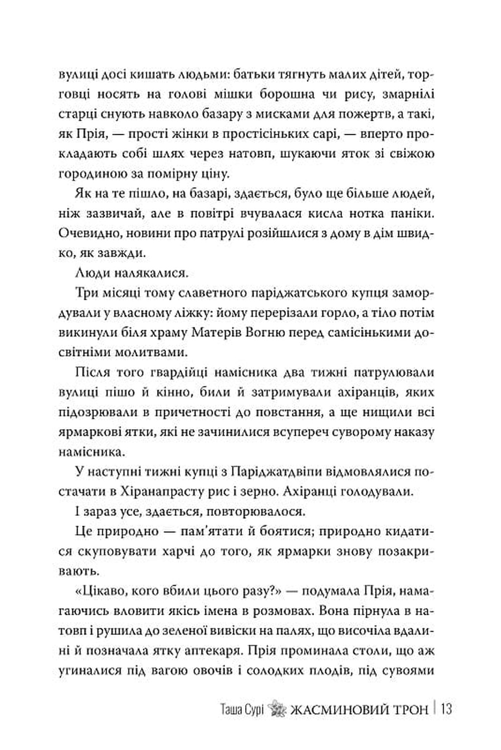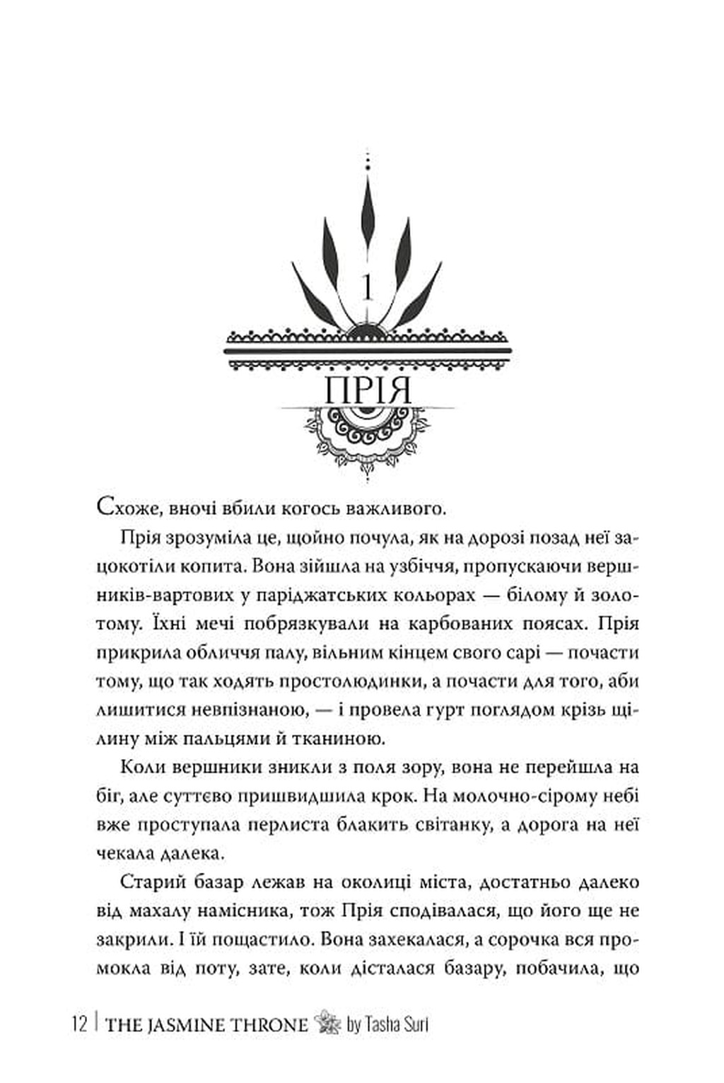 Жасминовий трон. Князівства у вогні. Книга 1 — це потужний старт фентезійної трилогії від Таші Сурі, яка майстерно переплітає політичні ігри з містичною спадщиною минулого. Принцеса Маліні, віддана рідним братом-фанатиком, ув'язнена у напівзруйнованому храмі Хірані. Її життя — це повільне згасання в очікуванні смерті, аж поки вона не зустрічає Прію. Прія — звичайна служниця з таємницею, здатною похитнути основи світу. Вона володіє магією, яка вважалася втраченою, і несе в собі силу древніх священнослужителів. Коли їхні долі переплітаються, народжується небезпечний союз: принцеса хоче повернути трон і помститися, а служниця прагне віднайти своє коріння та врятувати свій народ. Разом вони стануть іскрою, від якої спалахне вся імперія.