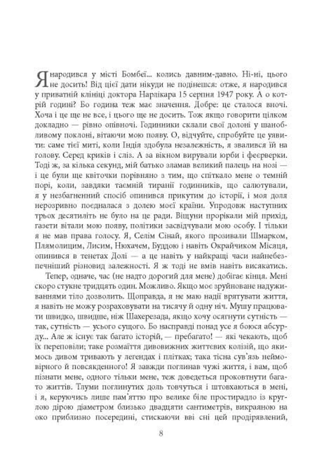 Опівнічні діти — це культовий твір Салмана Рушді, який після публікації у 1981 році миттєво став світовою сенсацією та приніс автору Букерівську премію. Головний герой, Селім Сінай, з'явився на світ рівно опівночі 15 серпня 1947 року — саме в ту секунду, коли Індія проголосила свою незалежність. Цей символічний збіг навіки пов'язав життя хлопчика з долею величезної країни. Селім наділений надзвичайним даром — телепатичним зв'язком із тисячею інших «дітей опівночі», які народилися в ту саму годину і володіють різноманітними магічними здібностями. Проте цей дар стає і його прокляттям: кожен вчинок Селіма відгукується в подіях державного масштабу, а його здоров'я безпосередньо залежить від добробуту нації. Це глибока, багатошарова історія, що поєднує в собі сімейну сагу, політичну алегорію та блискучий магічний реалізм.