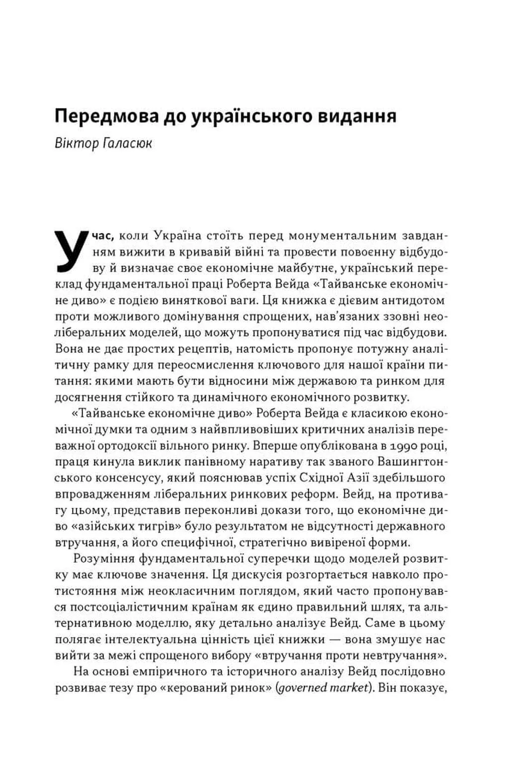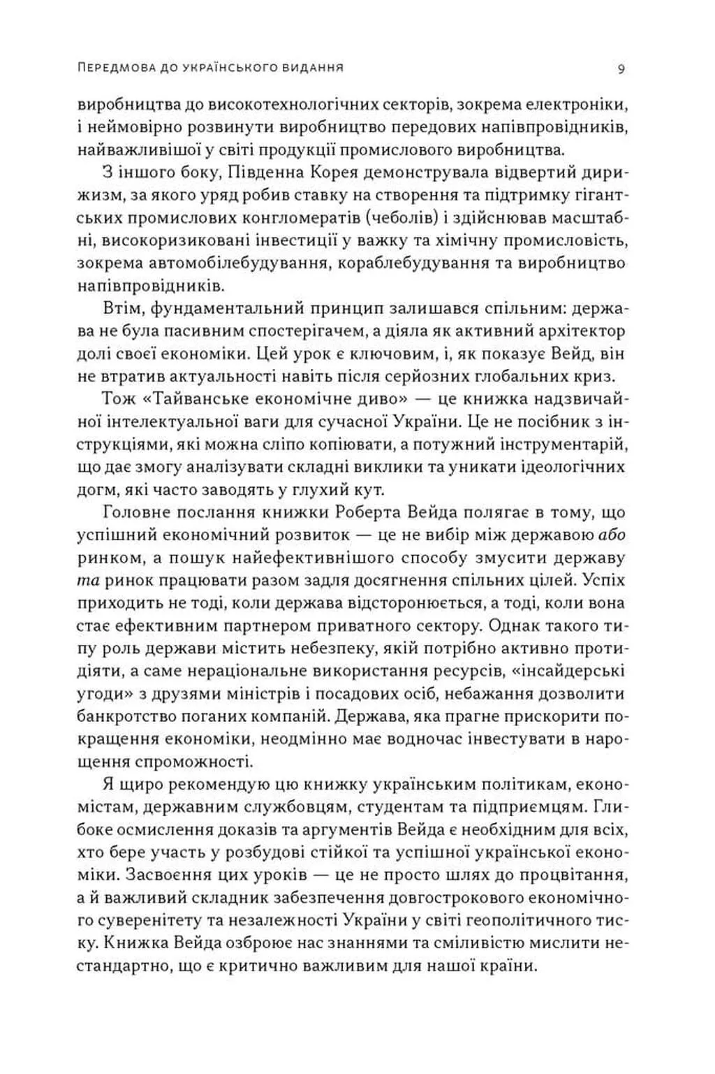 Тайванське економічне диво. Як невеликий острів став інноваційним центром світу — це знакова праця професора Роберта Вейда, яка пропонує критичний погляд на причини стрімкого злету Тайваню. Автор кидає виклик традиційним неокласичним теоріям вільного ринку, доводячи, що успіх острова не був випадковістю чи результатом простого наслідування ринкових сигналів. Натомість Вейд розкриває складну систему державного втручання, де уряд свідомо скеровував інвестиції у стратегічні галузі, використовував фіскальні стимули та створював потужні науково-дослідні інститути. Ця книга — детальний розбір механізмів «економіки розвитку», яка дозволила Тайваню пройти шлях від бідної аграрної колонії до світового лідера у сфері високих технологій та електроніки.