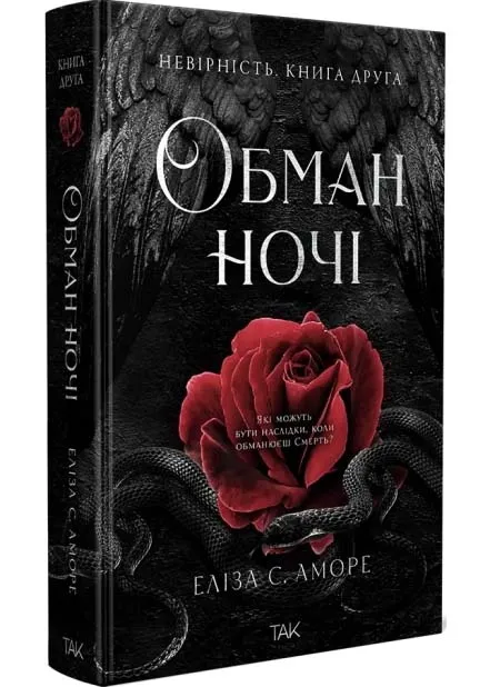 Обман ночі. Невірність — це друга книга захопливого циклу італійської письменниці Елізи С. Аморе, що стала справжнім хітом у жанрі роментезі. Минуло п'ять місяців відтоді, як Джемма та Еван, Янгол Смерті, що зрікся своєї суті заради почуттів, відчули смак спокійного щастя. Проте правила світобудови непохитні: Смерть не вибачає боргів і не відпускає тих, хто мав піти за нею. Коли на Джемму знову починається полювання, Еван змушений вдатися до відчайдушних кроків, щоб захистити кохану. Тепер небезпека чатує не лише в тінях, а й у самих стосунках героїв. Чи витримає їхня довіра тиск таємниць, за які доводиться платити кров'ю? Це емоційна історія про боротьбу з долею, де межа між порятунком і крахом стає тоншою за подих.