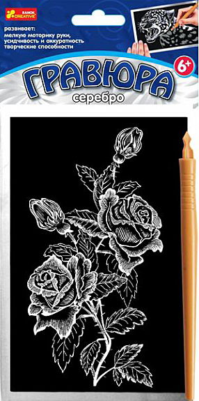 В набор входят пластина черного цвета, с нанесенным на нее контурным рисунком и пластмассовый штихель, для процарапывания рисунка.