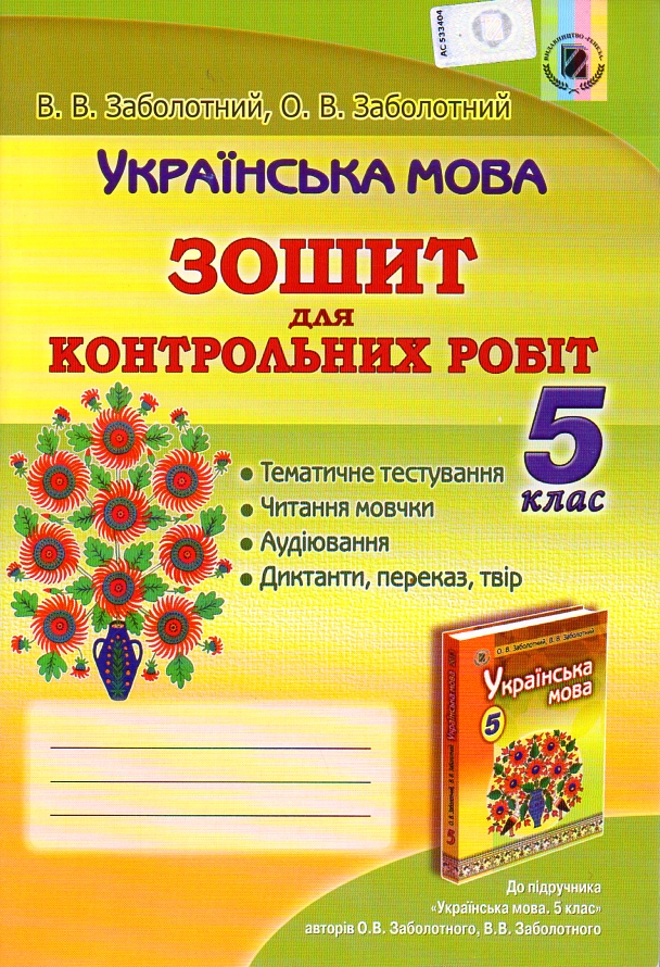 Зошит призначено для проведення всіх контрольних робіт з української мови в 5 класі, виконання яких повністю або частково передбачає письмову форму (тестування, диктанти, аудіювання, читання мовчки, перекази, твір). Укладено відповідно до нової (2012 р.) Програми з української мови для 5-9 класів загальноосвітніх навчальних закладів, державних санітарно-гігієнічних норм.