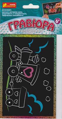 Царапай с удовольствием! Инструкция: 1. Сними защитную пленку. 2. Специальным штихелем (он входит в набор) по контурным линиям процарапай слой серой краски. 3. Протри изображение сухой мягкой салфеткой. 4. Гравюра готова! Она может украсить любой интерьер и послужить отличным подарком!