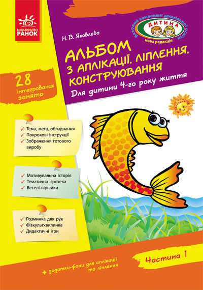 Посібник Н. В. Яковлєвої «Альбом з аплікації, ліплення, конструювання. Для дитини 4-го року життя. Частина 1» містить 28 інтегрованих занять, розроблених відповідно до вимог Програми виховання і навчання дітей від двох до семи років «Дитина». На запропонованих заняттях діти отримають уявлення про техніку аплікації, навчаться різноманітних прийомів ліплення, ознайомляться зі способами застосування природних матеріалів для створення різних виробів. Альбом побудовано за тематичним принципом, тематика занять пов’язана із сезонними явищами природи, традиціями української національної культури. Видання призначене для вихователів ДНЗ, батьків, студентів вищих навчальних закладів зі спеціальності «Дошкільне виховання».