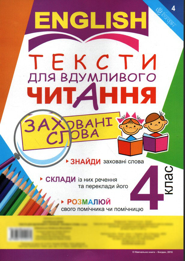 Пропоновані тексти для вдумливого читання містять лексичний матеріал широкого тематичного спектру, складені відповідно до вікових особливостей четвертокласників і відповідають чинній програмі МОН України з англійської мови. Вони сприятимуть активізації лексичних та граматичних знань, навичок логічного мислення школярів.