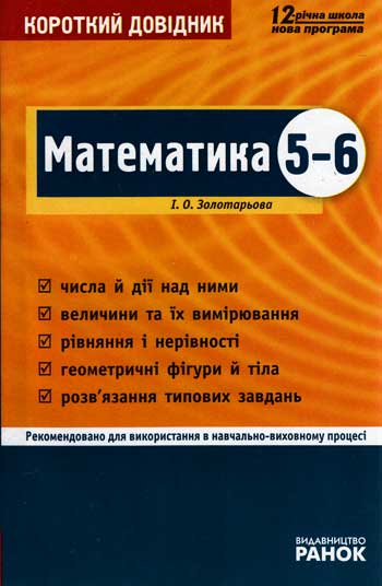 Довідник містить теоретичний матеріал про числа та дії над ними, величини та їх вимірювання рівняння і нерівності геометричні фігури й тіла, рішення типових задач