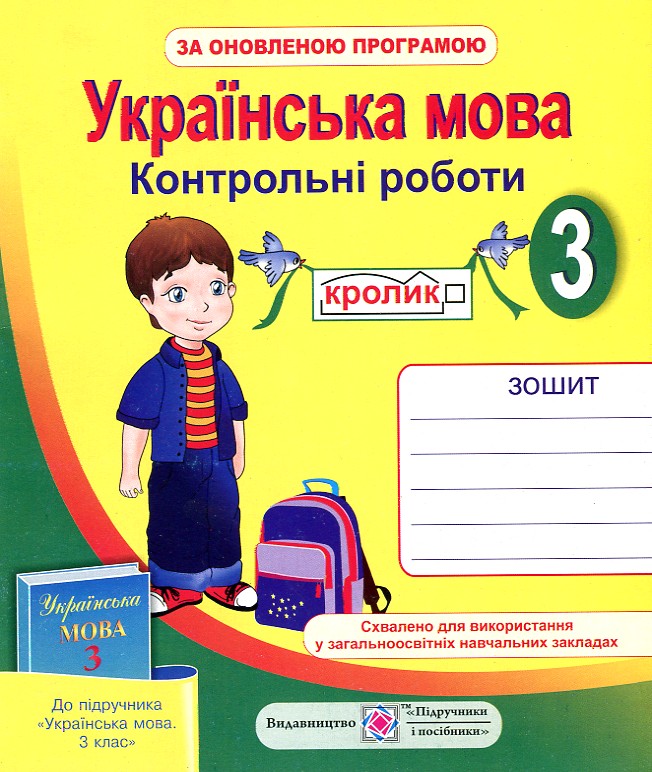 Зошит із друкованою основою містить усі види перевірки знань, умінь і навичок учнів з української мови у 3 класі, а саме: аудіювання, діалогічне мовлення, перевірка мовних знань і вмінь, усний переказ , диктант і списування. Методичні вказівки щодо роботи з цим зошитом уміщено в посібнику «Методичні рекомендації до зошита для контрольних робіт з української мови для 3 класу». Для учнів 3-го класу, учителів, батьків.