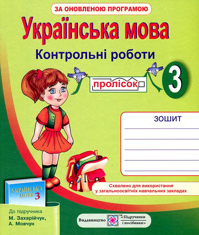 Зошит із друкованою основою містить усі види перевірки знань, умінь і навичок учнів з української мови у 3 класі, а саме: аудіювання, діалогічне мовлення, перевірка мовних знань і вмінь, усний переказ , диктант і списування. Методичні вказівки щодо роботи з цим зошитом уміщено в посібнику «Методичні рекомендації до зошита для контрольних робіт з української мови для 3 класу». Для учнів 3-го класу, учителів, батьків.