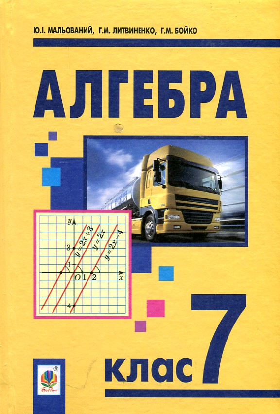 Пропонований підручник відповідає програмі з алгебри для 7-го класу й передбачає готовність учнів до широкого і свідомого застосування математики. Цю орієнтацію забезпечують зміст курсу, характер викладення навчального матеріалу, добір ілюстрацій і приклади застосувань, запитання для перевірки знань, задачі і вправи на повторення, а також письмові роботи, призначені для самоконтролю. Для учнів і вчителів загальноосвітніх навчальних закладів.