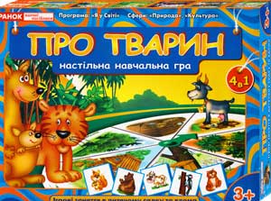 Ігрові заняття в дитячому садку та вдома.. До набору входять: ігрове поле, 35 карток, кубик, 4 фішки, правила гри. Гра допоможе: навчитися класифікувати тварин за групами, логічно мислити й висловлювати свої думки, розвивати увагу й пам`ять.