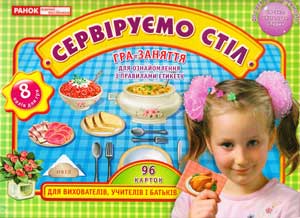 До набору входять: методичні рекомендації, 96 карток із зображенням столового посуду, кухонного посуду та страв, 8 полів для ігри з твердого картону. Для дітей від 4 років