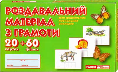 Роздавальний матеріал з грамоти для дитячих садків. Роздавальний матеріал місить 20 карток із зображенням предметів та їхніх схем, 60 фішок, методичні рекомендації щодо використання роздавального матеріалу з грамоти. Роздавальний матеріал з грамоти ознайомить дошкільнят з основами української фонетики й орфоепії, навчить дітей проводити елементарний фонетичний аналіз окремих звуків української мови, сформує у дітей уміння будувати звуков схеми, сприятиме розвиткові дитячої уваги, пам`яті та логічного мислення.