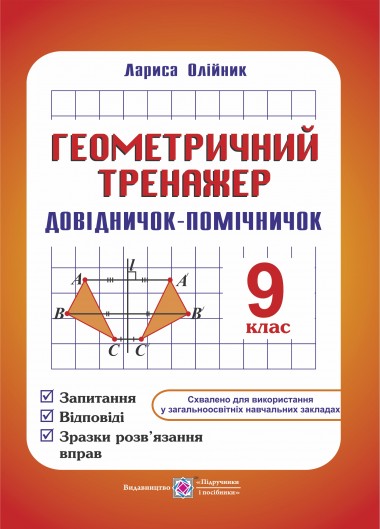 - Посібник містить весь теоретичний матеріал з геометрії для 9 класу загальноосвітньої школи, поданий у вигляді запитань і відповідей. Запропоновані зразки розв’язання задач і вправ, а також завдання для підготовки до самостійних робіт. Для вчителів математики й учнів 9 класу.