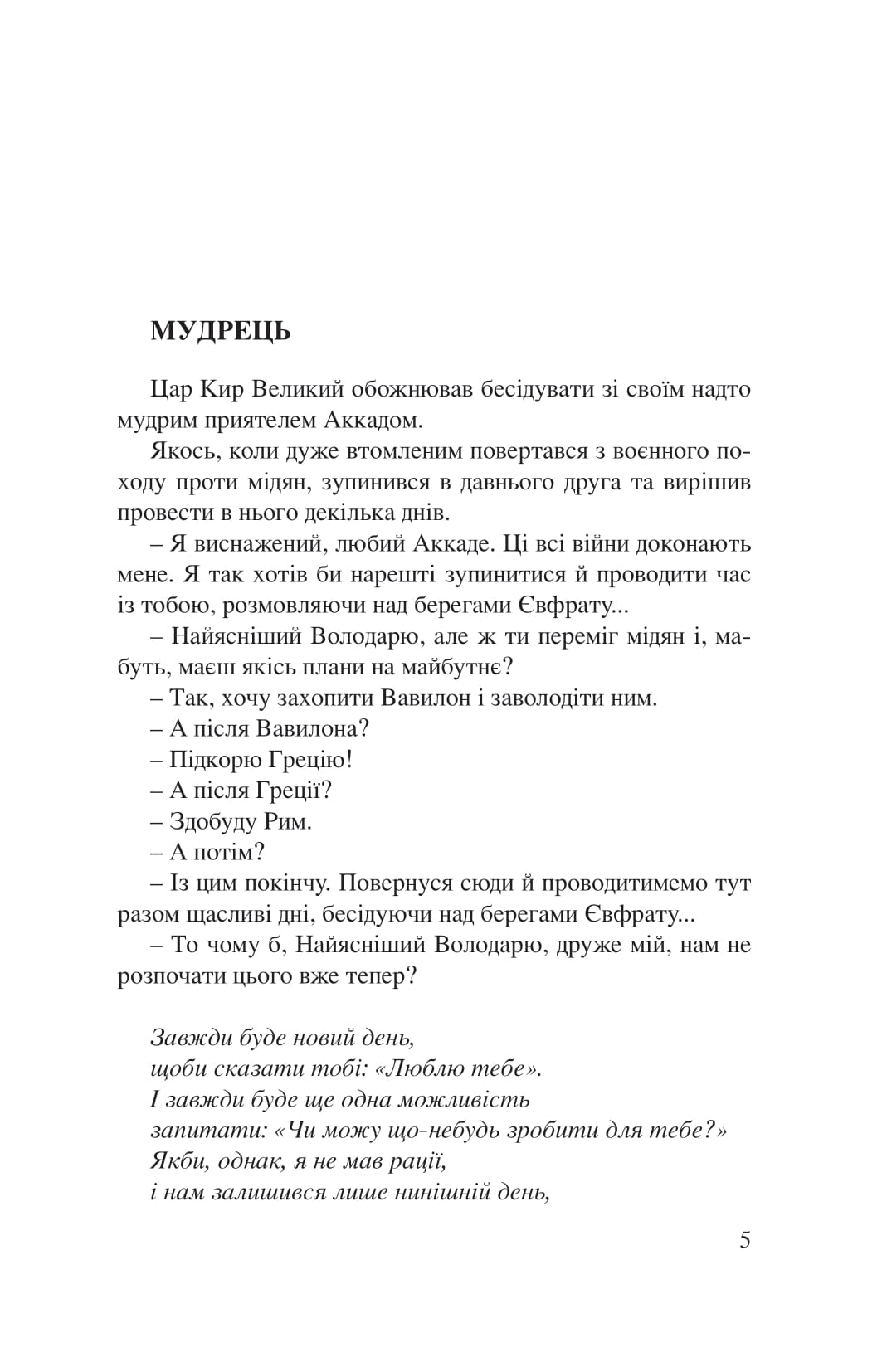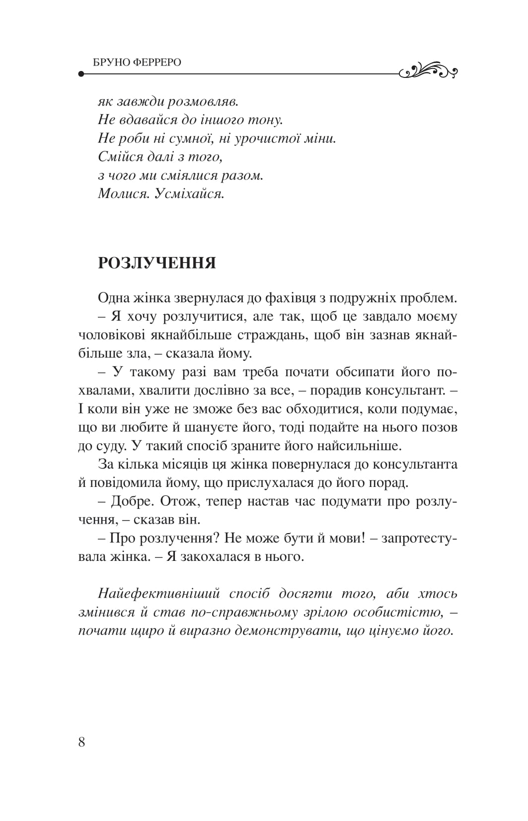 Коротенькі душевні оповідки, які змушують замислитися над більшим, ніж повсякденні клопоти. Чи задумувалися над тим, чого прагне ваша душа? Як ми проживаємо день, який є найкращим подарунком від Бога? Подаруйте душі невимовний спокій та затишок, читаючи маленькі історії від улюбленого Бруно Ферреро. Адже загальновідомий факт — внутрішній спокій дарує можливість для нових звершень.