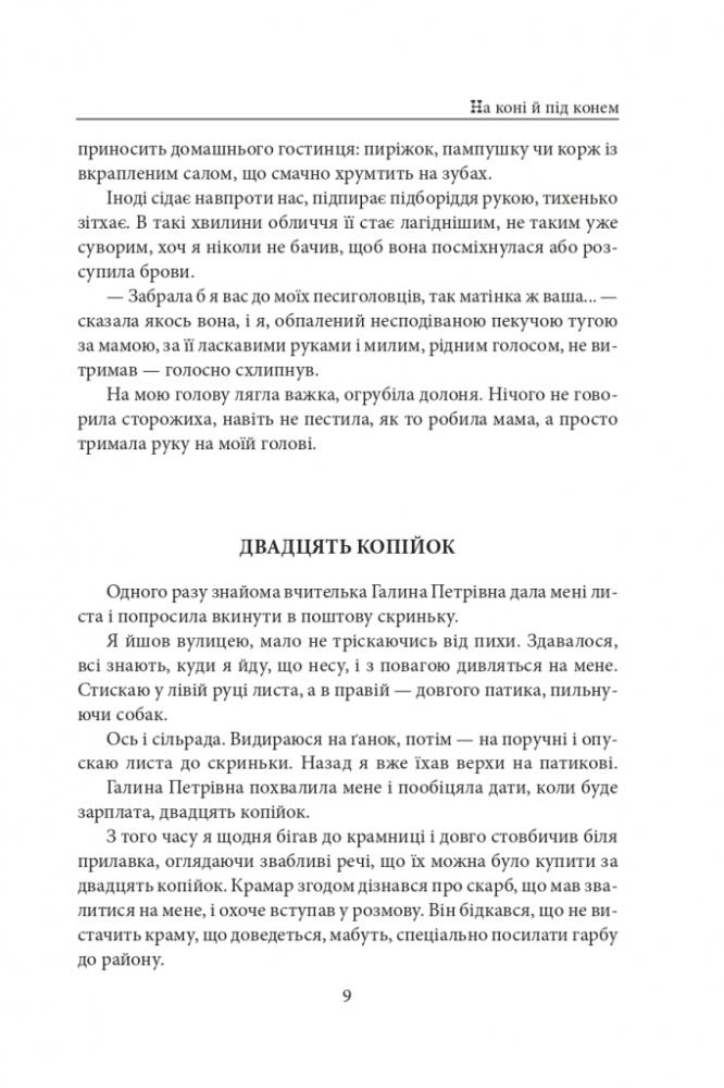 В автобіографічних творах «На коні й під конем» і «Блакитна дитина» розповідається про дітлахів передвоєнних років. Ось уже кілька поколінь читачів радіють і сумують, ростуть і дорослішають разом із головним героєм Толиком. І якщо на перших сторінках книжки вони знайомляться із звичайним маленьким хлопчиком, в міру слухняним, в міру бешкетним, то розлучаються вже з солдатом, який за один день зрозумів, що таке війна, людське життя і смерть. Ця правдива і неймовірно лірична історія, часом весела, часом сумна, безперечно, буде цікава кожному читачеві, спонукаючи до осмислення життя.