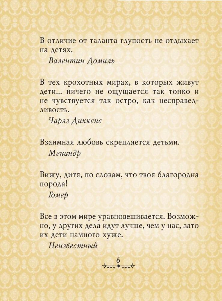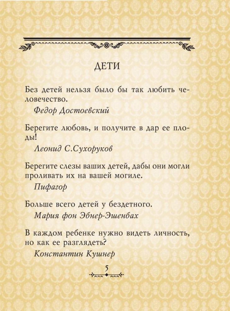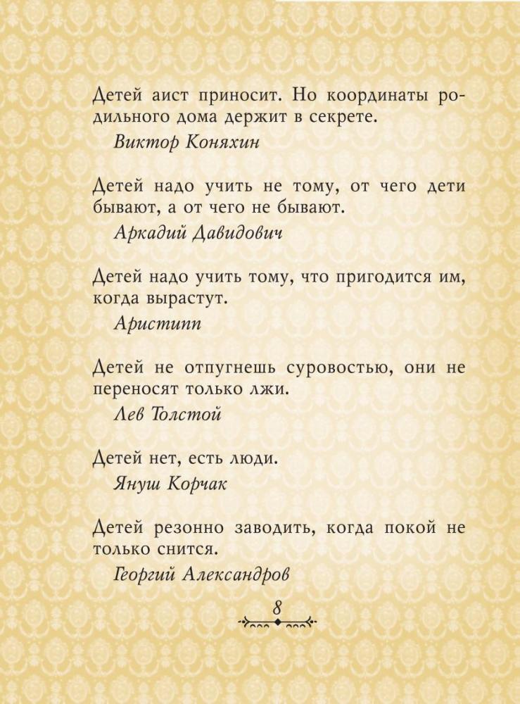 Отцы и дети — вечная проблема, старая, как мир и актуальная как никогда. Эта тема практически неисчерпаема, и свидетельство тому — книга, которую вы держите в руках. В ней собраны высказывания знаменитых людей прошлого и современности о детях и родителях, семье, воспитании, связи поколений — афоризмы серьезные, философские, ироничные и очень остроумные.
