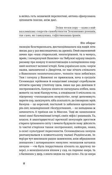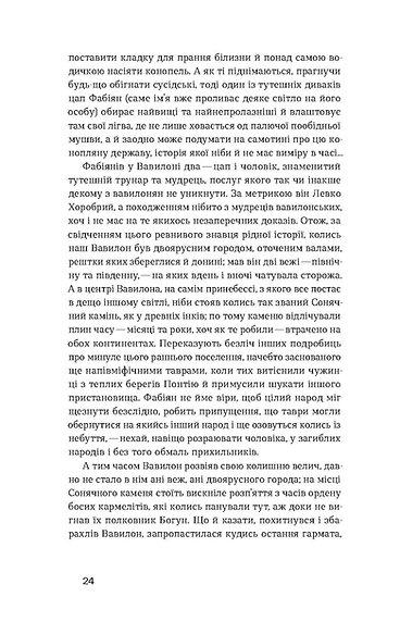 Василь Земляк пише про знайомі, на перший погляд, реалії: українське село 1920—1940-х, революція, руйнування шляхетських садиб, перші комуни, колгоспи, Друга світова. Однак усе подано в якійсь геть незвичній перспективі. Старенький Вавилон на Побужжі, селяни, які викопують під грушею колекцію старовинної зброї, місцевий філософ, який читає Платона й розповідає про таврів і скіфів, гойдалка, побудована агентом з продажу швейних машинок «Зінґер», щоб видати доньок заміж, цап Фабіян, що стає задом до розстрільної бригади — все це сплітається у химерний роман на тлі чорторию великої історії.