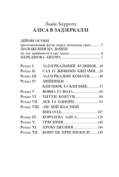Аліса в Задзеркаллі - чудове продовження першої книги класика англійської літератури Льюїса Керролла - Аліси в Країні Чудес. Вийшла вона через шість років, у 1871 році й одразу ж здобула армію прихильників, які з нетерпінням чекали нової зустрічі з дівчинкою Алісою.