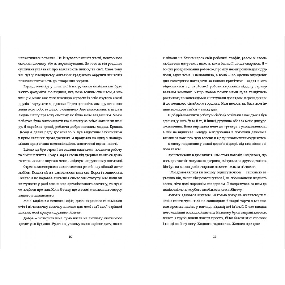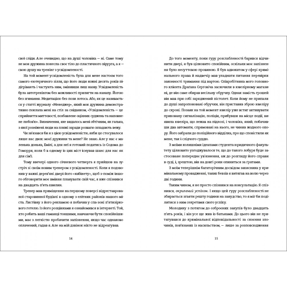 Бйорн Дімель — адвокат у кримінальних справах. І не те щоб він святий, але його клієнти, безумовно, не святіші від нього; піклування про них забезпечило йому та його родині комфортне життя; однак є тут і негативний бік: це також призвело до краху в шлюбі між Бйорном та його дружиною. Катаріна, дружина Бйорна, змусила його відвідати семінар з усвідомленості, щоб він став хорошим батьком та вони змогли відновити їхню родину. Інакше вона розлучиться з ним і забере від нього їхню спільну дитину. Навчання дійсно приносить плоди, і Бйорн навіть може інтегрувати те, чого він навчився, у свою роботу: він просто вбиває свого клієнта ― за всіма правилами усвідомленості… І так само, за правилами, розв’язує супутні проблеми. Дебютний роман Карстена Дюсса — це трилер у не зовсім традиційному розумінні. Це кримінальна історія, наповнена чорним гумором та сатирою, яку ви точно не залишите, не дочитавши до кінц