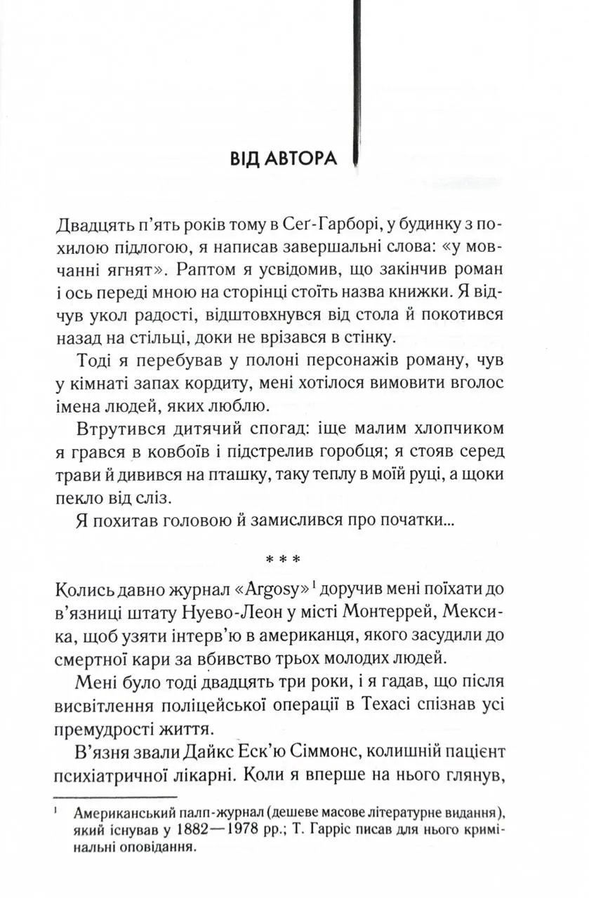 • Переможець Bram Stoker Award у категорії «Найкращий роман» (1988 р.)• № 16 серед «100 кращих детективних романів усіх часів» за версією Асоціації детективних письменників США• Однойменна екранізація здобула 5 «Оскарів»Убивця і колишній судовий психіатр Ганнібал Лектер усе ще перебуває в тюремній психіатричній лікарні. Цього разу до нього по допомогу у встановленні особистості чергового серійного злочинця звертається молода стажистка ФБР Кларіс Старлінг. І поки між ними зав’язуються непрості стосунки, маніяк на прізвисько Баффало Білл викрадає доньку сенатора. У ФБР є три дні, щоб знайти дівчину, а для Ганнібала це шанс на укладання вигідної угоди. Яким він неодмінно скористається…Сенсаційна екранізація роману «Мовчання ягнят» (в 1991 році) отримала 5 премій «Оскар».Саме в цьому фільмі Ентоні Гопкінс вперше виконав роль Ганнібала Лектера, якого можна бачити в фільмі загалом не більше 16 хвилин, однак це дозволило актору отримати «Оскар» у номінації «Найкраща чоло