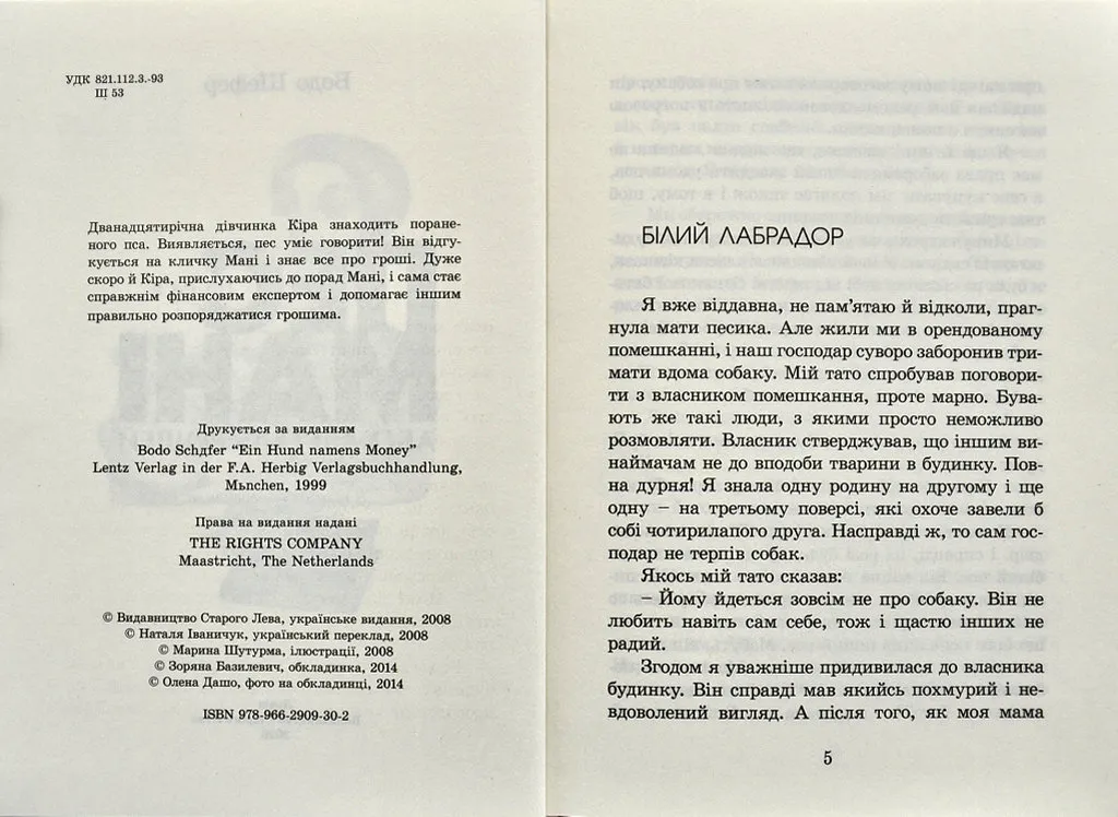 Кіра знаходить пораненого пса. Виявляється, пес уміє розмовляти! Він відгукується на кличку Мані і знає все про гроші. Дуже скоро Кіра, прислухаючись до порад Мані і сама стає справжнім фінансовим експертом і допомагає іншим правильно розпоряджатися грошима.Книжка фінансового консультанта, письменника і бізнесмена Бодо Шефера вчить дітей правильному ставленню до грошей. Але вона стане у пригоді і дорослим, котрі захочуть прислухатися до порад і зробити своє життя вільним від фінансових клопотів.