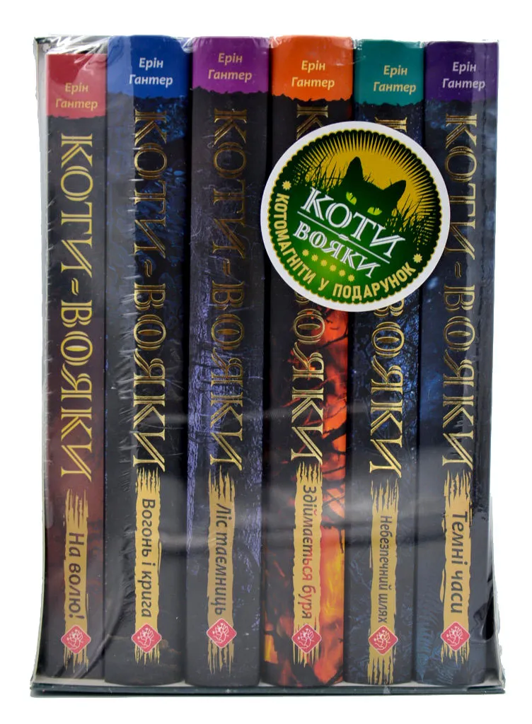 Шість книг першого циклу «Пророцтва починаються»: «На волю! (м'яка обкладинка)», «Вогонь і крига», «Ліс таємниць», «Здіймається буря», «Небезпечний шлях» та «Темні часи»;Стильний подарунковий бокс;Сувенір — фірмовий котомагніт до кожної книги!
