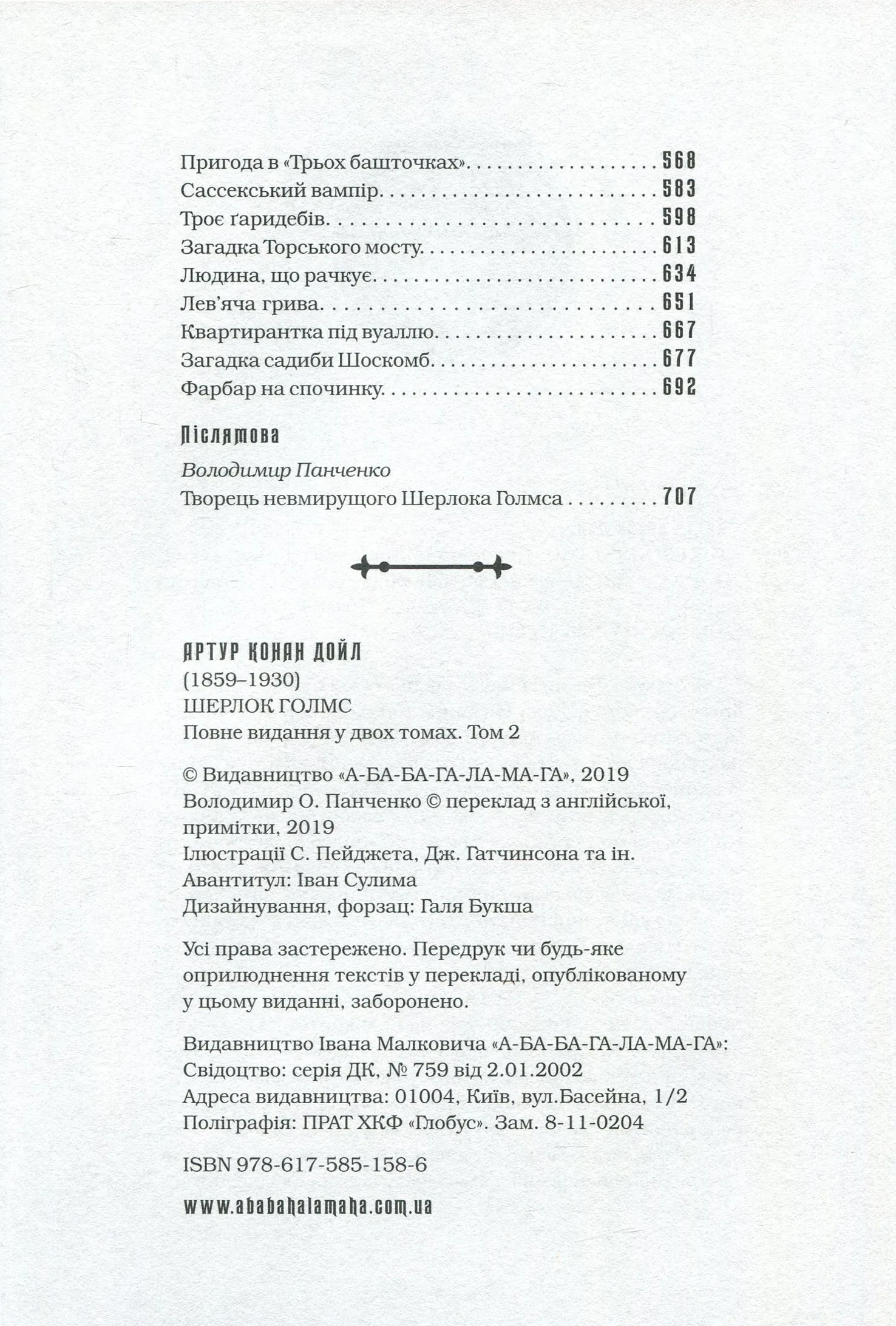 Видавництво «А-БА-БА-ГА-ЛА-МА-ГА» пропонує читачам перший в Україні повний переклад циклу повістей і оповідань Артура Конан Дойла про пригоди славетного детектива у новому перекладі талановитого сучасного перекладача і вченого Володимира Панченка. І самі твори, і оригінальні ілюстрації кінця XIX – початку XX століть, запозичені з прижиттєвих видань творів письменника, допоможуть вам по-справжньому зануритись у неповторну атмосферу вікторіанської Англії.