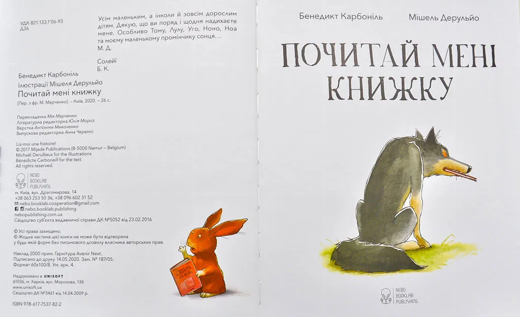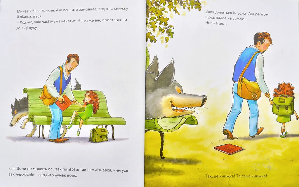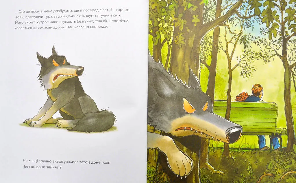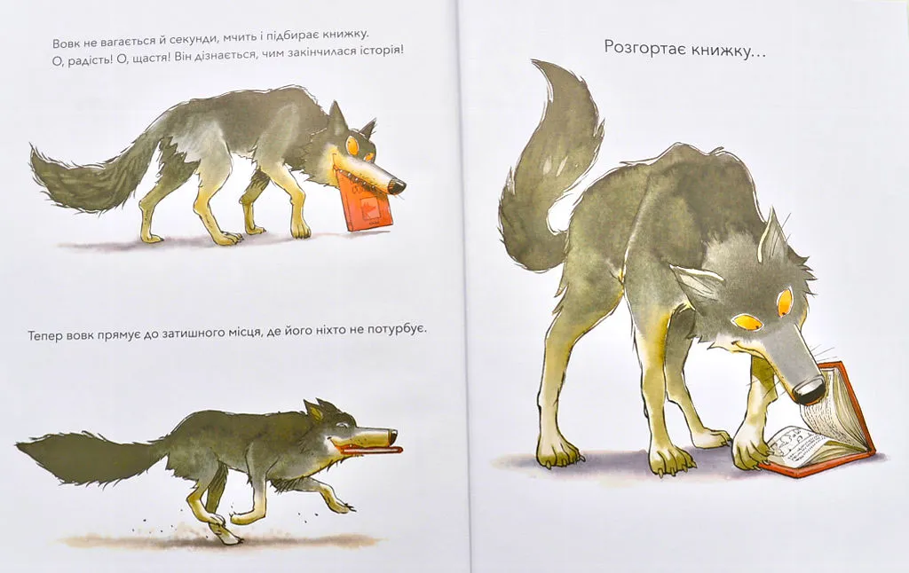 — Хто посмів мене розбудити? — гарчить вовк. Он воно що! Це тато читає книжку своїй донечці! За звичайних обставин вовк просто з’їв би цих чужинців, але не тепер… Тепер він страшенно боїться впустити бодай слівце з чарівної історії! Аж раптом тато згортає книжку. Хто ж допоможе вовкові дізнатися кінець історії?