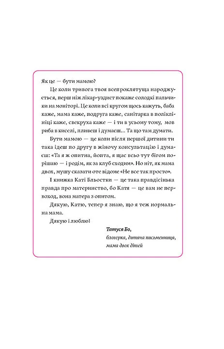 Ця книжка про реальне, живе, неідеальне материнство. Про матеру, яка через призму гумору та самоіронії, використовуючи легку дозу елегантних матюків, намагається день перестоять і ніч передержатись. Від тесту на вагітність до баталій у садочку. Про перші купання, зуби, соплі й незручні запитання.