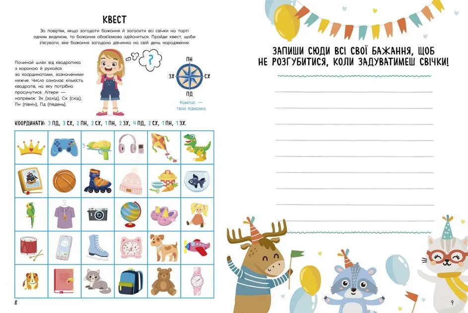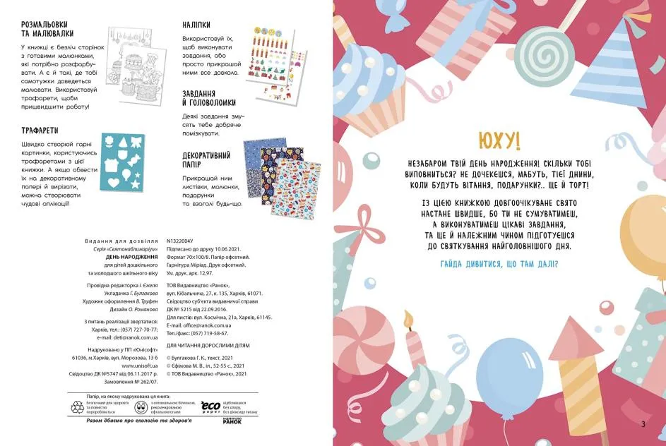 Книжка-активіті «День народження» серії «Святонаближаріум» допоможе підготуватися до найособливішого свята. Тут є тематичні творчі завдання, що розважать дитину напередодні, під час та навіть після дня народження. Також у книжці є безліч наліпок, трафаретів і декоративного паперу для прикрас. А найважливіше – тут ховається святковий настрій! Це чудовий подарунок іменинникові, який полюбляє влаштовувати свята власноруч.