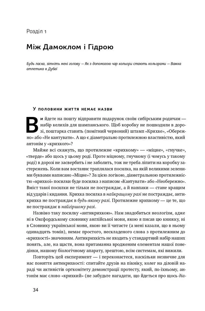 Наше життя неможливе без хаосу, мінливості та стресу, які постійно тиснуть на нас. В умовах невизначеності ми прагнемо сталості, однак саме вона стає перешкодою на шляху до розвитку. Дивовижно, та завдяки невизначеності і впливу змін люди, речі та цілі системи можуть еволюціонувати й ставати кращими. Цю рису Насім Талеб називає антикрихкістю й окреслює прості правила, які допоможуть обернути непередбачуваність і невизначеність на джерело самовдосконалення. Ба більше, ця властивість дає користь як людям, так і компаніям і навіть країнам, а коло питань, які допомагає з’ясувати книжка, надзвичайно широке — від методу помилок, оцінювання ризику до політики, освіти й медицини.